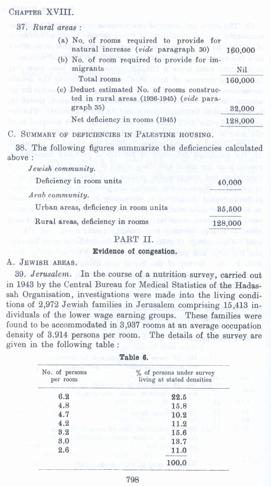 39. Jerusalem. In the course of a nutrition survey, carried out in 1943 by the Central Bureau for Medical Statistics of the Hadassah Organisation, investigations were made into the living conditions of 2,972 Jewish families in Jerusalem comprising 15,413 individuals of the lower wage earning groups. These families were found to be accommodated in 3 ,937 rooms at an average occupation density of 3.914 persons per room. The details of the survey are given in the following table :