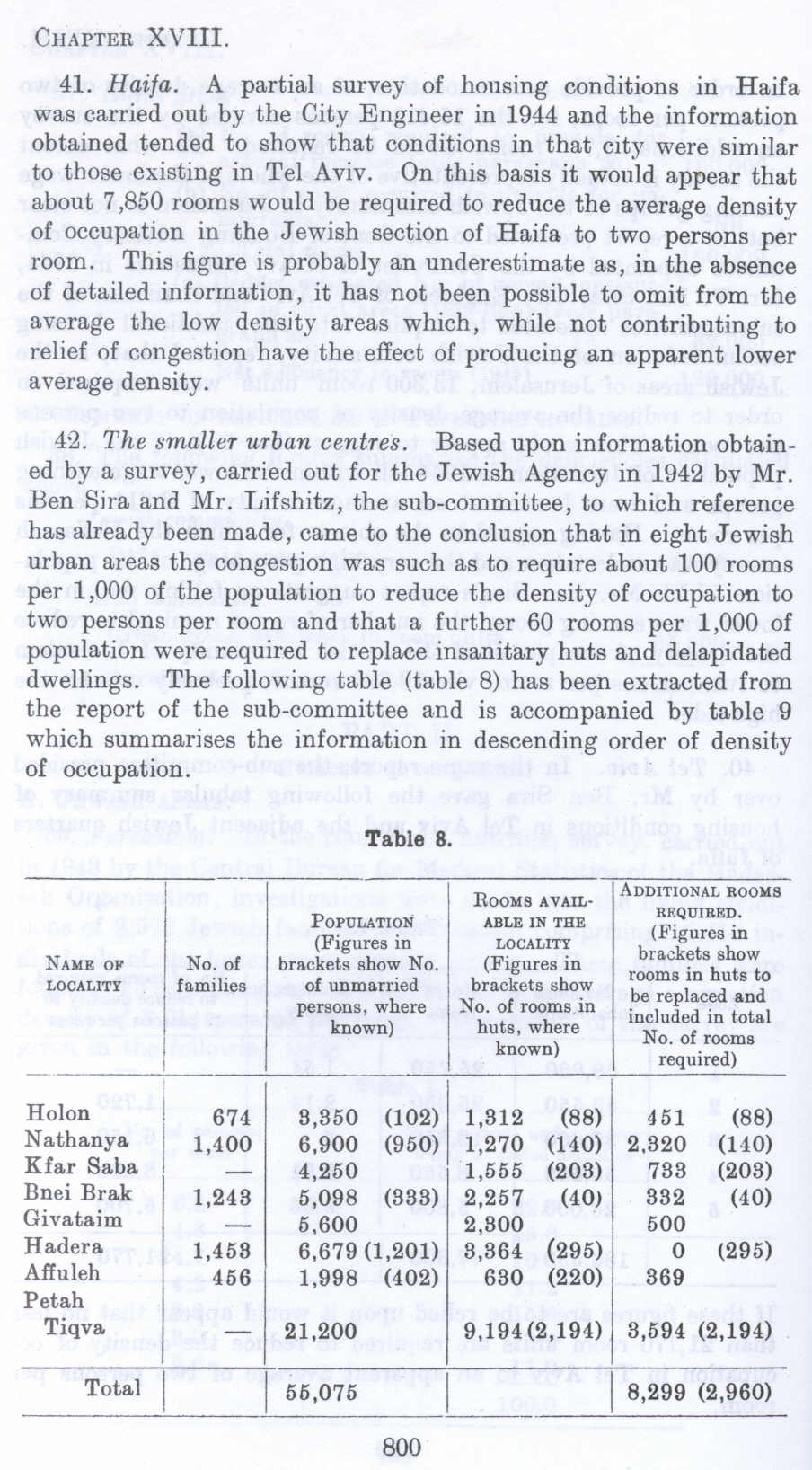 42. The smaller urban centres. Based upon information obtained by a survey, carried out for the Jewish Agency in 1942 by Mr. Ben Sira and Mr. Lifshitz, the sub-committee, to which reference has already been made, came to the conclusion that in eight Jewish urban areas the congestion was such as to require about 100 rooms per 1,000 of the population to reduce the density of occupation to two persons per room and that a further 60 rooms per 1,000 of population were required to replace insanitary huts and dilapidated dwellings. The following table (table 8) has been extracted from the report of the sub-committee and is accompanied by table 9 which summarises the information in descending order of density of occupation.