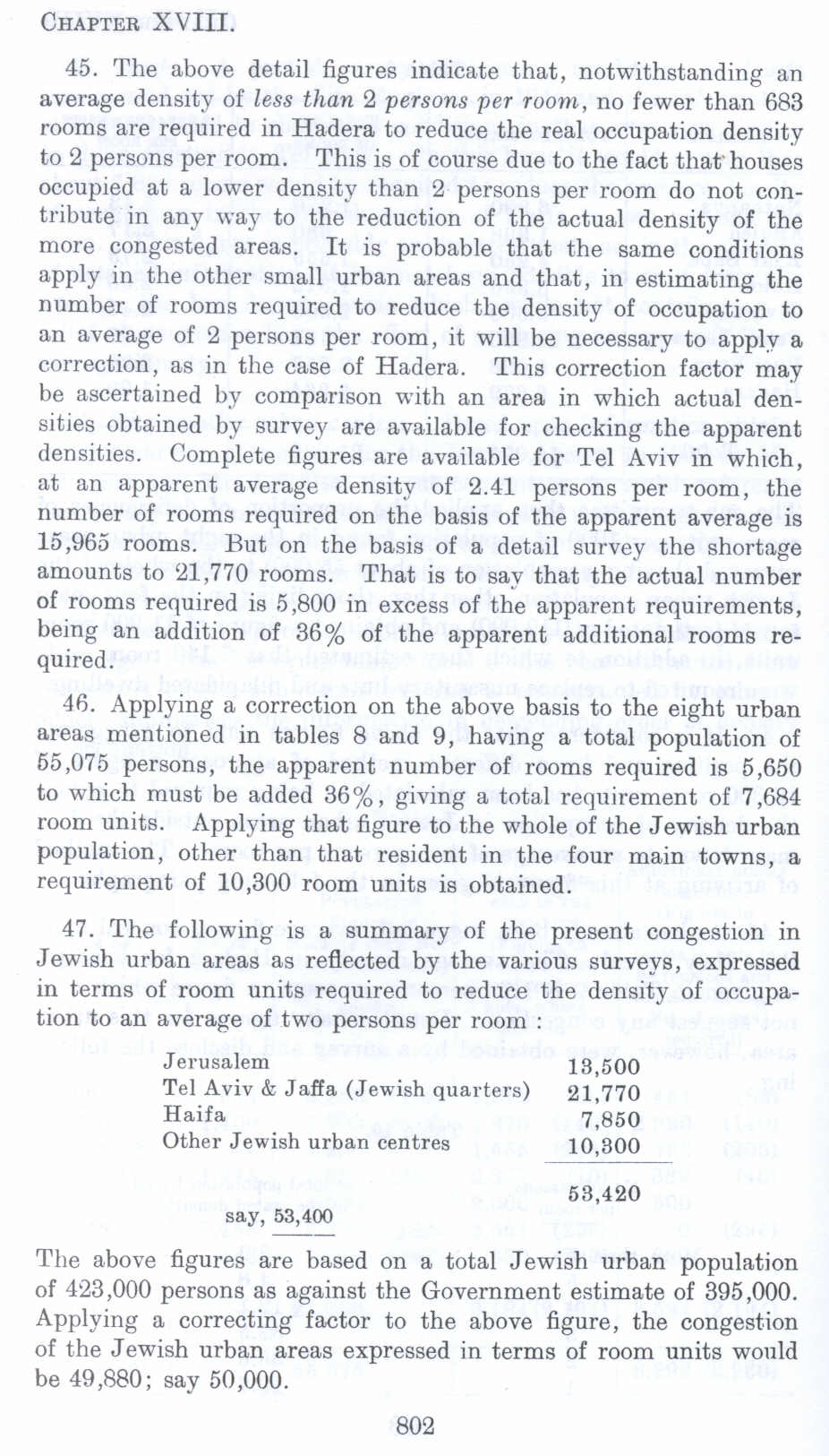 The above figures are based on a total Jewish urban population of 423,000 persons as against the Government estimate of 395,000. Applying a correcting factor to the above figure, the congestion of the Jewish urban areas expressed in terms of room units won Id be 49,880; say 50,000.