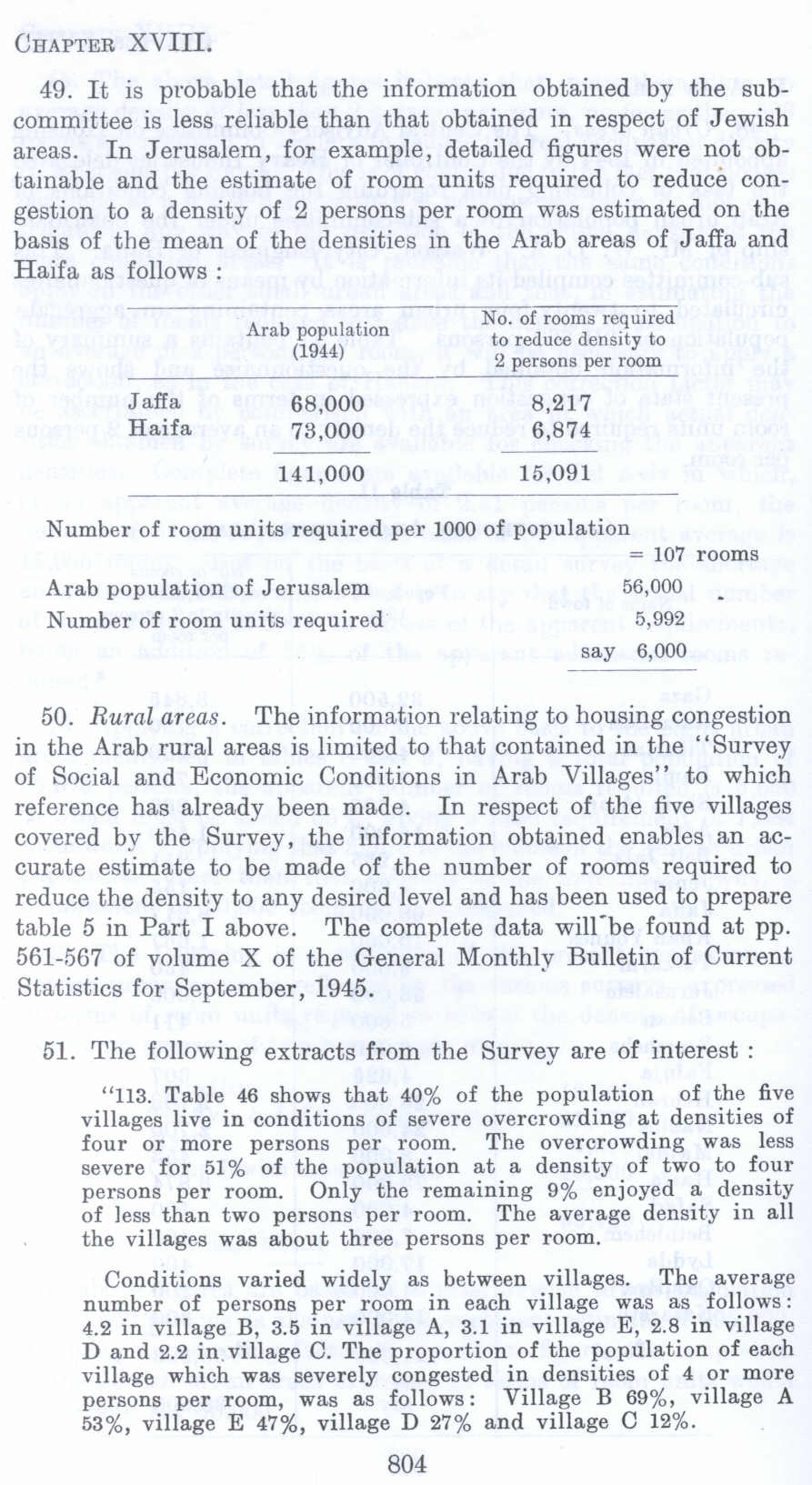 49. It is probable that the information obtained by the subcommittee is less reliable than that obtained in respect of Jewish areas. In Jerusalem, for example, detailed figures were not obtainable and the estimate of room units required to reduce congestion to a density of 2 persons per room was estimated on the basis of the mean of the densities in the Arab areas of Jaffa and Haifa as follows :