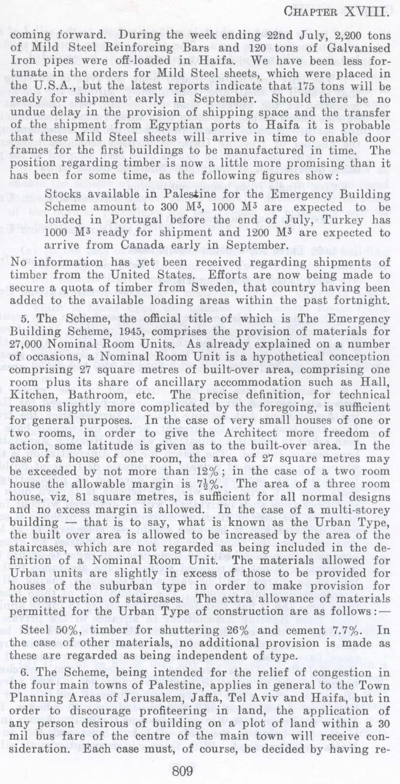 coming forward. During the week ending 22nd July, 2,200 tons of Mild Steel Reinforcing Bars and 120 tons of Galvanised Iron pipes were off-loaded in Haifa. We have been less fortunate in the orders for Mild Steel sheets, which were placed in the U.S.A., but the latest reports indicate that 175 tons will be ready for shipment early in September. Should there be no undue delay in the provision of shipping space and the transfer of the shipment from Egyptian ports to Haifa it is probable that these Mild Steel sheets will arrive in time to enable door frames for the first buildings to be manufactured in time. The position regarding timber is now a little more promising than it has been for some time, as the following figures show: