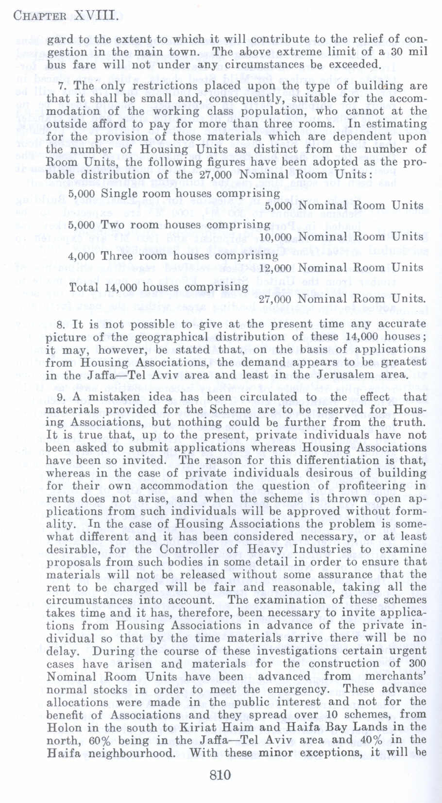 8. It is not possible to give at the present time any accurate picture of the geographical distribution of these 14,000 houses; it may, however, be stated that, on the basis of applications from Housing Associations, the demand appears to be greatest in the Jaffa and Tel Aviv area and least in the Jerusalem area.
