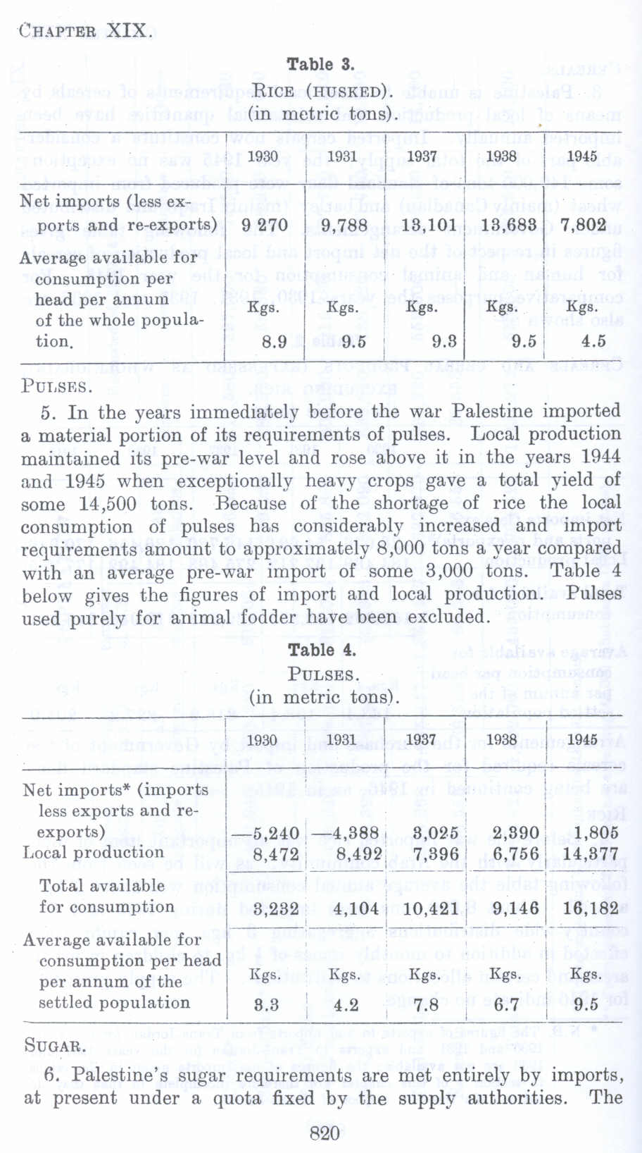 5. In the years immediately before the war Palestine imported a material portion of its requirements of pulses. Local production maintained its pre-war level and rose above it in the years 1944 and 1945 when exceptionally heavy crops gave a total yield of some 14,500 tons. Because of the shortage of rice the local consumption of pulses has considerably increased and import requirements amount to approximately 8,000 tons a year compared with an average pre-war import of some 3,000 tons. Table 4 below gives the figures of import and local production. Pulses used purely for animal fodder have been excluded.