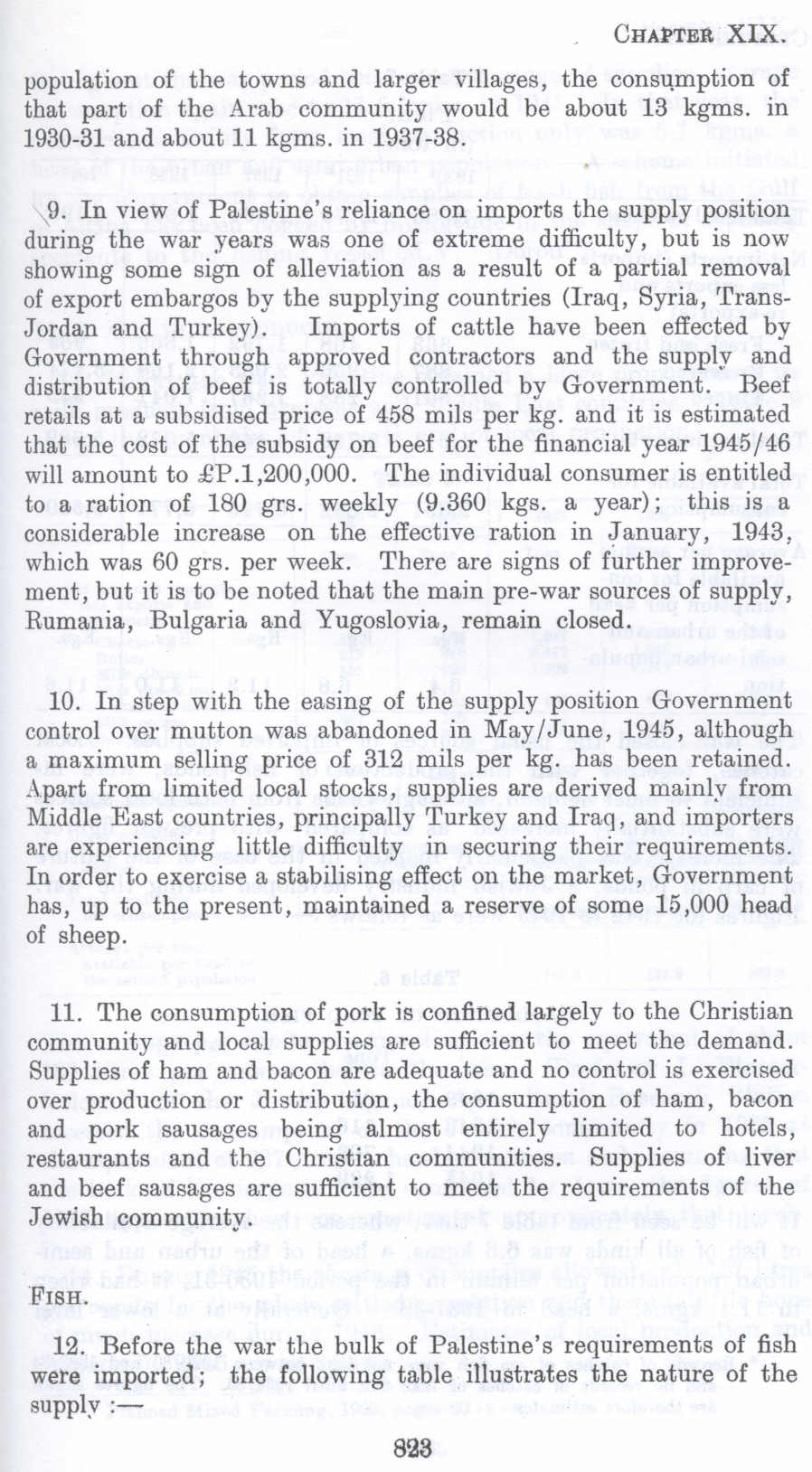 11. The consumption of pork is confined largely to the Christian community and local supplies are sufficient to meet the demand. Supplies of ham and bacon are adequate and no control is exercised over production or distribution, the consumption of ham, bacon and pork sausages being almost entirely limited to hotels, restaurants and the Christian communities. Supplies of liver and beef sausages are sufficient to meet the requirements of the Jewish community.