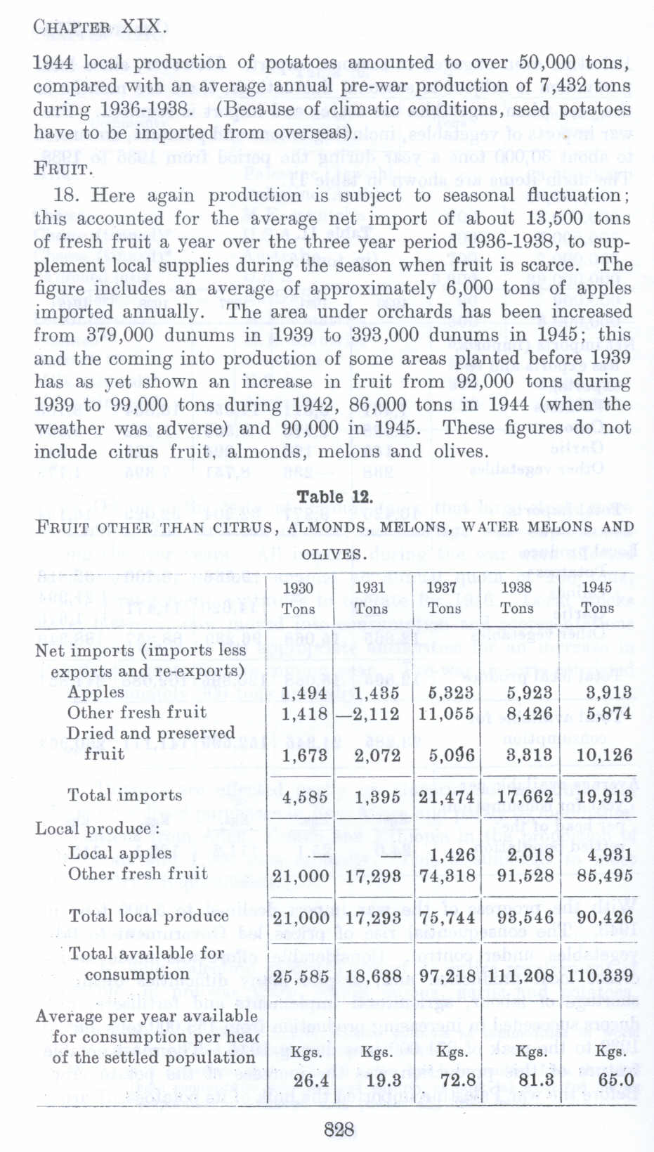 18. Here again production is subject to seasonal fluctuation; this accounted for the average net import of about 13,500 tons of fresh fruit a year over the three year period 1936-1938, to supplement local supplies during the season when fruit is scarce. The figure includes an average of approximately 6,000 tons of apples imported annually. The area under orchards has been increased from 379 ,000 dunums in 1939 to 393 ,000 dunums in 1945; this and the coming into production of some areas planted before Hl39 has as yet shown an increase in fruit from 92,000 tons during 1939 to 99,000 tons during 1942, 86,000 tons in 1944 (when the weather was adverse) and 90 ,000 in 1945. These figures do not include citrus fruit, almonds, melons and olives.