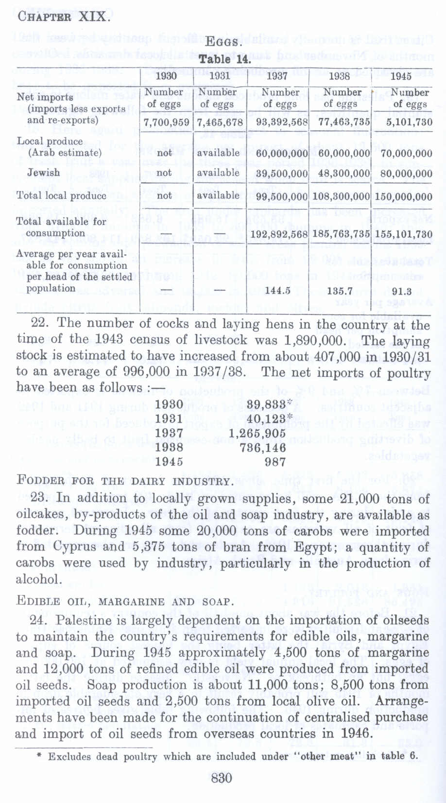 22. The number of cocks and laying hens in the country at the time of the 1943 census of livestock was 1,890,000. The laying stock is estimated to have increased from about 407,000 in 1930/31 to an average of ()96,000 in 1937 /38. The net imports of poultry have been as follows