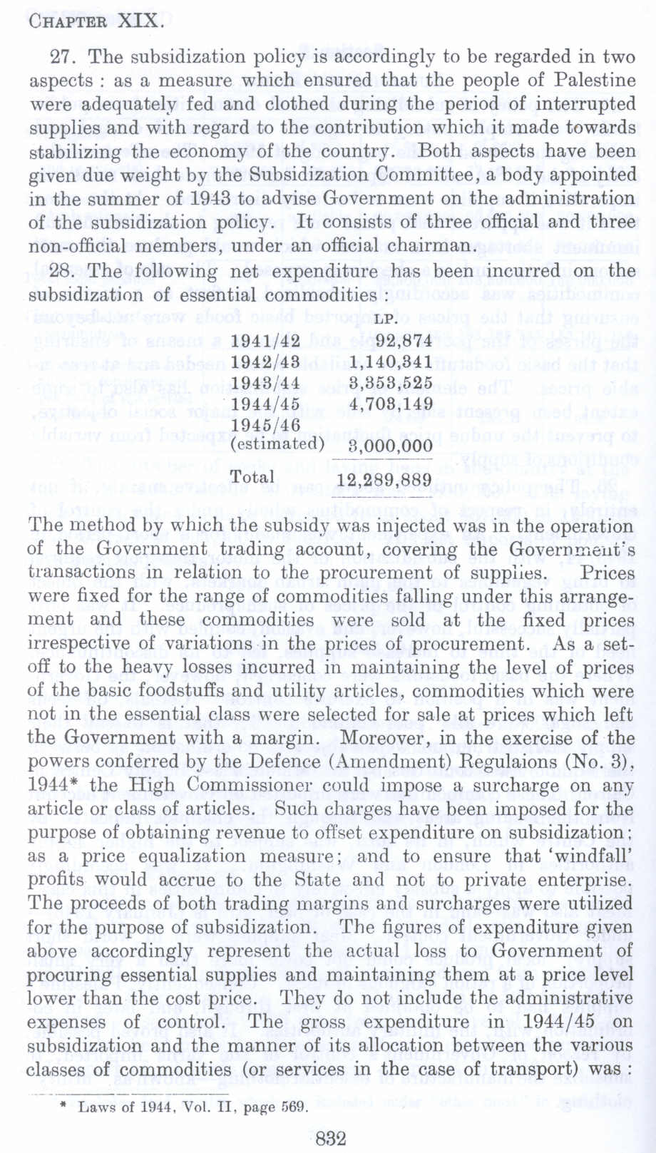 27. The subsidization policy is accordingly to be regarded in two aspects : as a measure which ensured that the people of Palestine were adequately fed and clothed during the period of interrupted supplies and with regard to the contribution which it made towards stabilizing the economy of the country. Both aspects have been given due weight by the Subsidization Committee, a body appointed in the summer of 1943 to advise Government on the administration of the subsidization policy. It consists of three official and three non-official members, under an official chairman.