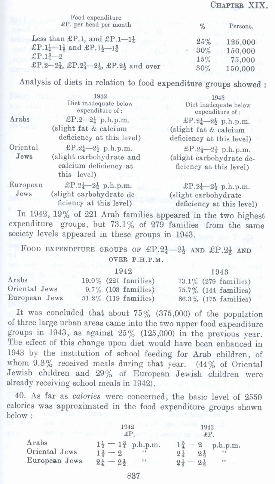 It was concluded that about 75% (375,000) of the population of three large urban areas came into the two upper food expenditure groups in l!J43, as against 25% (125,000) in the previous year. The effect of this change upon diet would have been enhanced in 1943 by the institution of school feeding for Arab children, of whom 9.3% received meals during that year. (44% of Oriental Jewish children and 29% of European Jewish children were already receiving school meals in 1942).