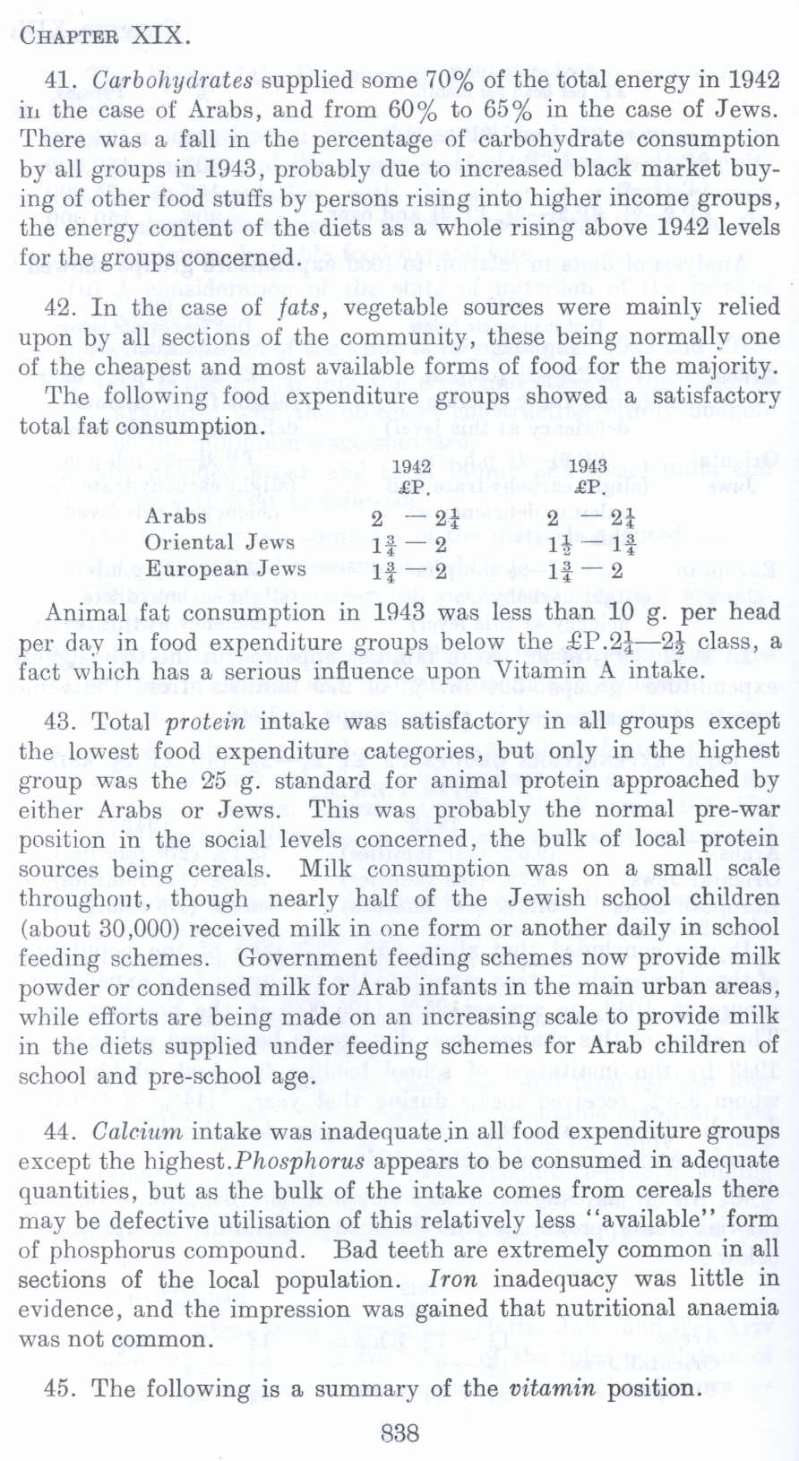 41. Carbohydrates supplied some 70% of the total energy in 1942 iu the case of Arabs, and from 60% to 65% in the case of Jews. There was a fall in the percentage of carbohydrate consumption by all groups in 1943, probably due to increased black market buying of other food stuffs by persons rising into higher income groups, the energy content of the diets as a whole rising above 1942 levels for the groups concerned.