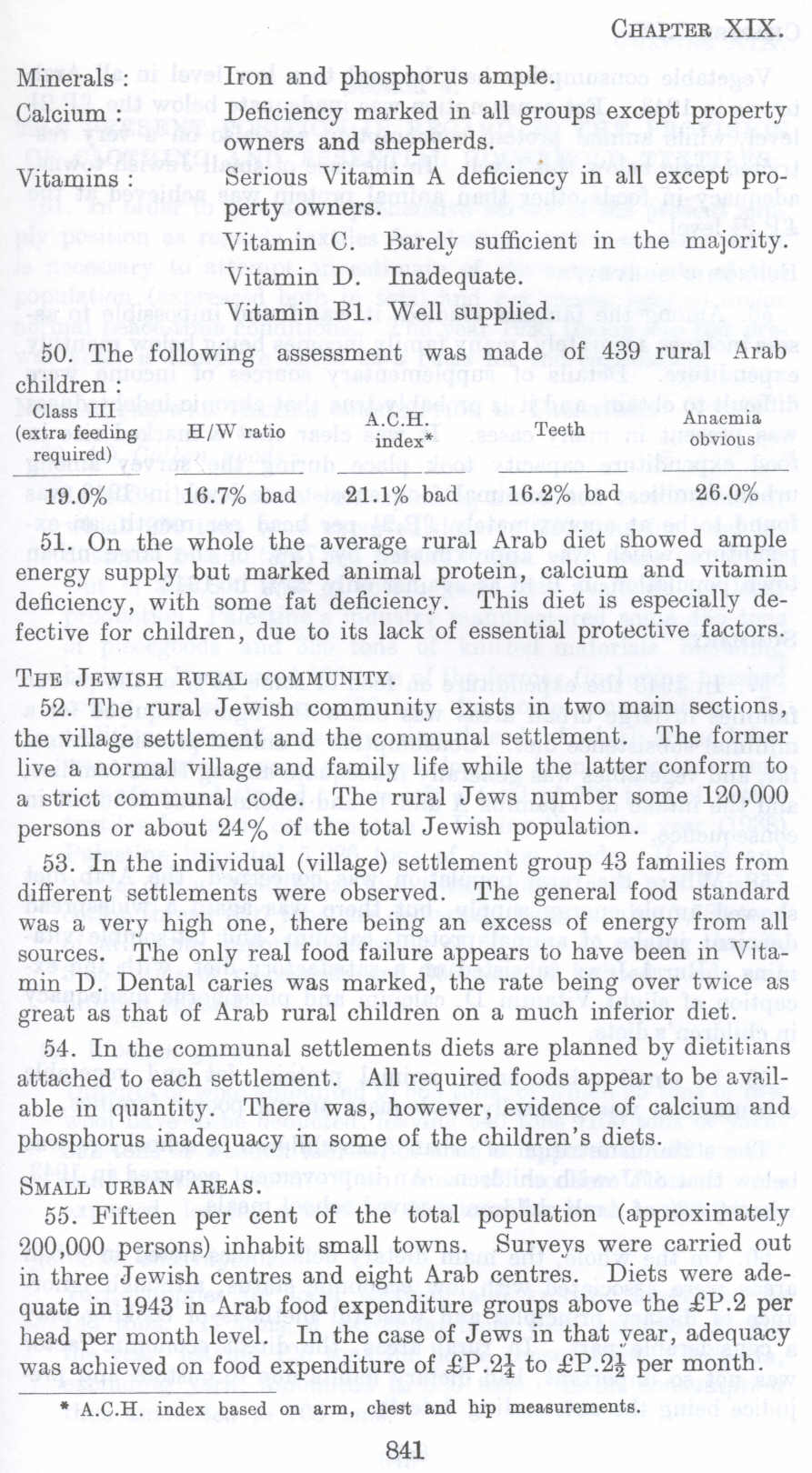 51. On the whole the average rural Arab diet showed ample energy supply but marked animal protein, calcium and vitamin deficiency, with some fat deficiency. This diet is especially defective for children, due to its lack of essential protective factors.