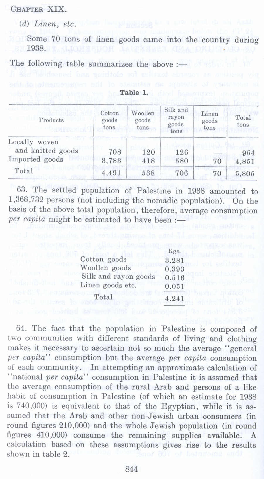 64. The fact that the population in Palestine is composed of two communities with different standards of living and clothing makes it necessary to ascertain not so much the average "general per capita" consumption but the average per capita consumption of each community. In attempting an approximate calculation of "national per capita" consumption in Palestine it is assumed that the average consumption of the rural Arab and persons of a like habit of consumption in Palestine (of which an estimate for 1938 is 740,000) is equivalent to that of the Egyptian, while it is assumed that the Arab and other non-Jewish urban consumers (in round figures 210 ,000) and the whole Jewish population (in round figures 410 ,000) consume the remaining supplies available. A calculation based on these assumptions gives rise to the results shown in table 2.