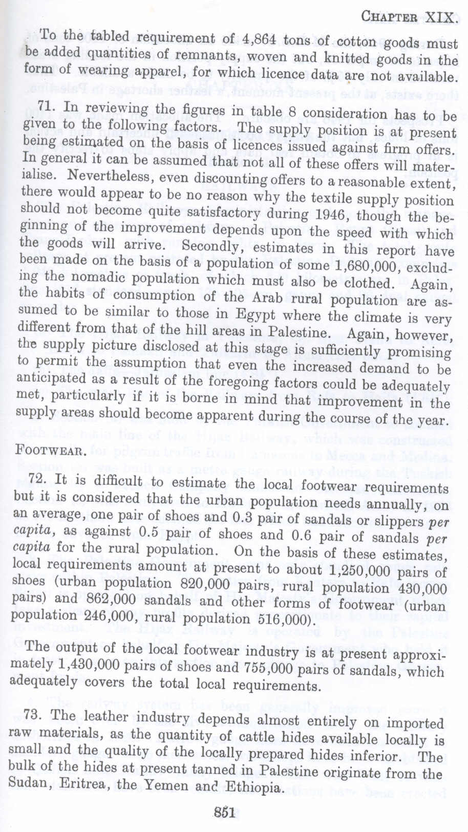 71. In reviewing the figures in table 8 consideration has to be given to the following factors. The supply position is at present being estimated on the basis of licences issued against firm offers. In general it can be assumed that not all of these offers will materialise. Nevertheless, even discounting offers to a reasonable extent, there would appear to be no reason why the textile supply position should not become quite satisfactory during 1946, though the beginning of the improvement depends upon the speed with which the goods will arrive. Secondly, estimates in this report have been made on the basis of a population of some 1,680,000, excluding the nomadic population which must also be clothed. Again, the habits of consumption of the Arab rural population are assumed to be similar to those in Egypt where the climate is very different from that of the hill areas in Palestine. Again, however, the supply picture disclosed at this stage is sufficiently promising to permit the assumption that even the increased demand to be anticipated as a result of the foregoing factors could be adequately met, particularly if it is borne in mind that improvement in the supply areas should become apparent during the course of the year.