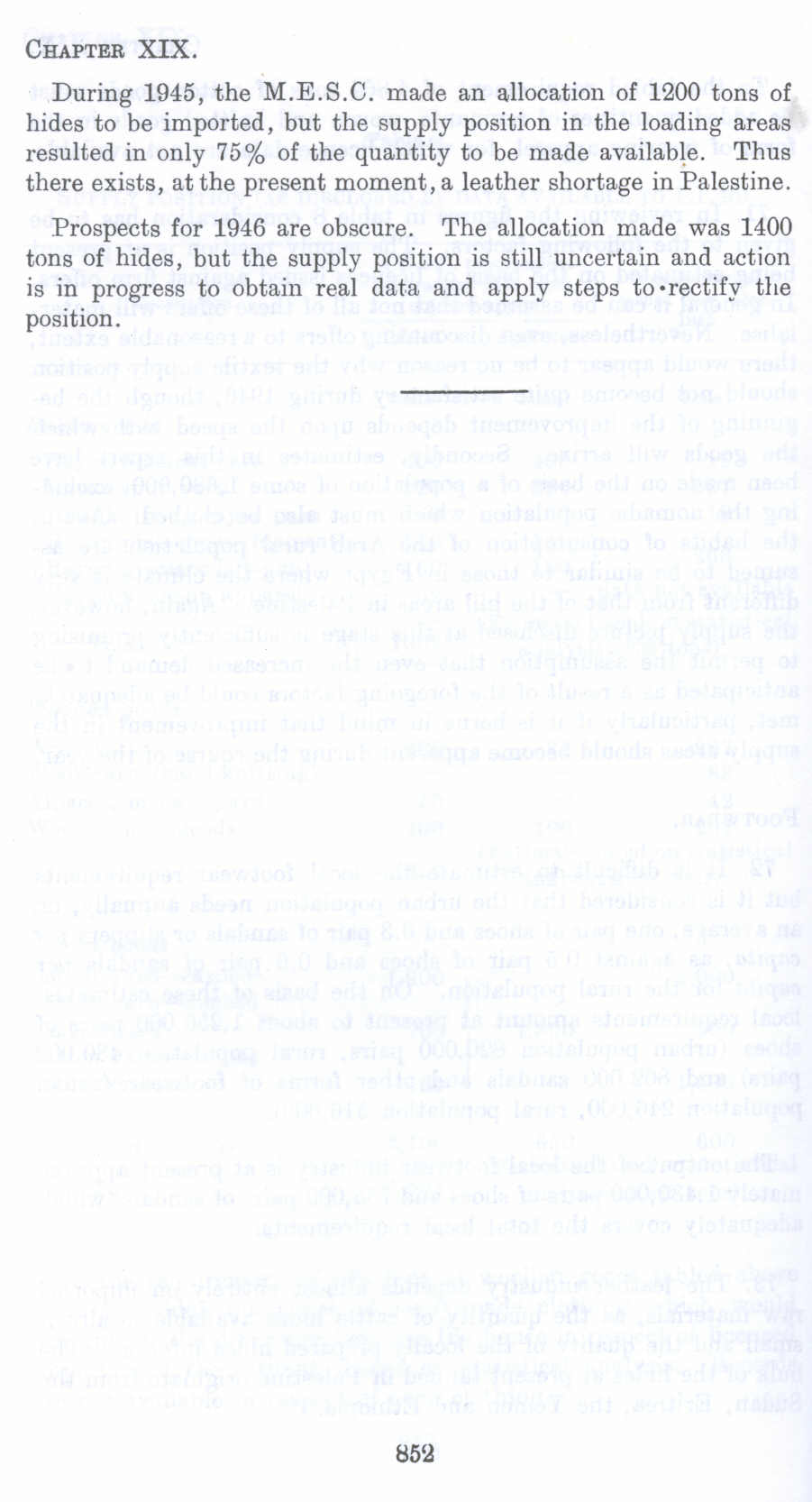During 1945, the M.E.S.C. made an allocation of 1200 tons of hides to be imported, but the supply position in the loading areas resulted in only 75% of the quantity to be made available. Thus there exists, at the present moment, a leather shortage in Palestine.