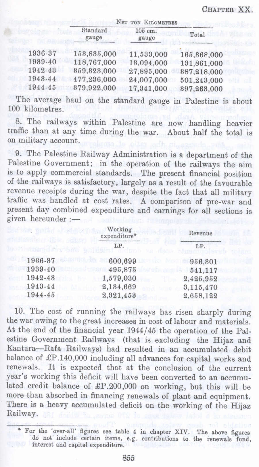 9. The Palestine Railway Administration is a department of the Palestine Government; in the operation of the railways the aim is to apply commercial standards. The present financial position of the railways is satisfactory, largely as a result of the favourable revenue receipts during the war, despite the fact that all military traffic was handled at cost rates. A comparison of pre-war and present day combined expenditure and earnings for all sections is given hereunder :-