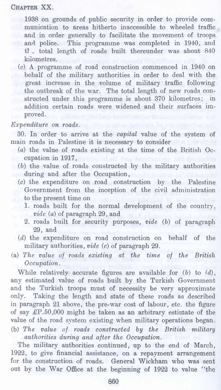 While relatively accurate figures are available for (b) to !d), any estimated value of roads built by the Turkish Government and the Turkish troops must of necessity be very approximate only. Taking the length and state of these roads as described in paragraph 21 above, the pre-war cost of labour, etc. the figure of say £P. 50 ,000 might be taken as an arbitrary estimate of the value of the road system existing when military operations began. (b) The value of roads constructed by the British 1nilitary