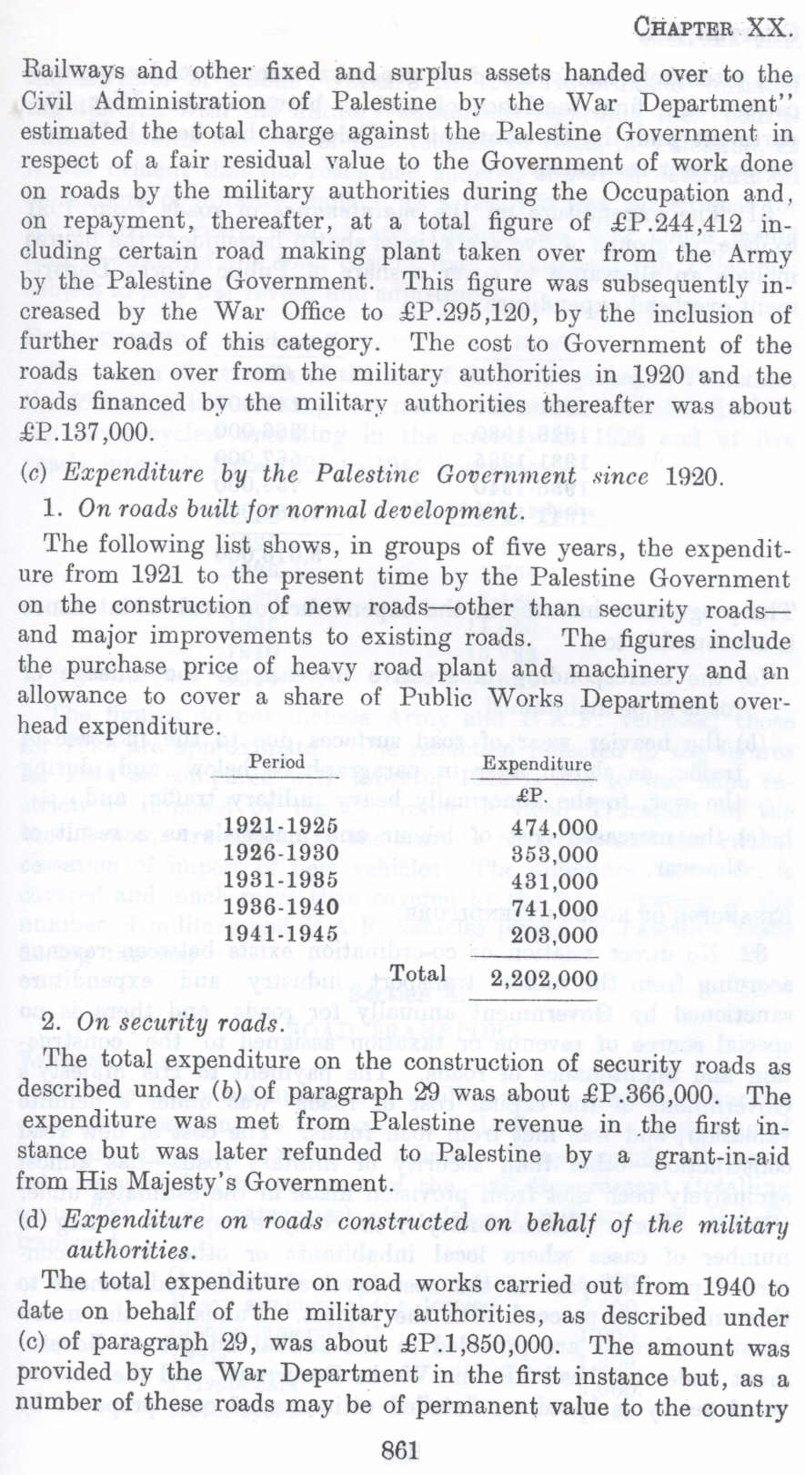 The total expenditure on the construction of security roads as described under (b) of paragraph 29 was about £P.366,000. The expenditure was met from Palestine revenue in .the first instance but was later refunded to Palestine by a grant-in-aid from His Majesty's Government.
