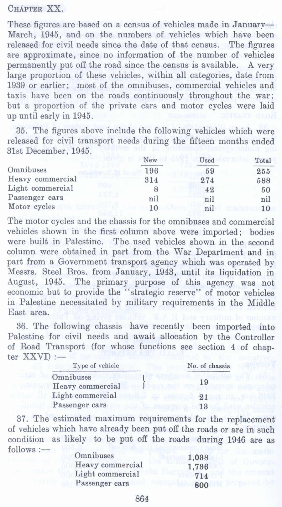 The motor cycles and the chassis for the omnibuses and commercial vehicles shown in the first column above were imported; bodies were built in Palestine. The used vehicles shown in the second column were obtained in part from the War Department and in part from a Government transport agency which was operated by Messrs. Steel Bros. from January, 1943, until its liquidation in August, 1945. The primary purpose of this agency was not economic but to provide the "strategic reserve" of motor vehicles in Palestine necessitated by military requirements in the Middle East area.
