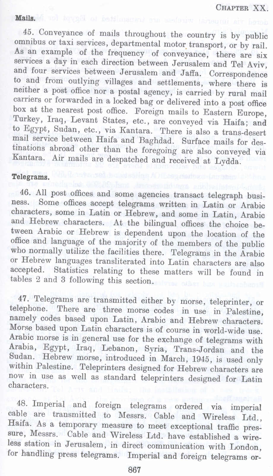 47. Telegrams are transmitted either by morse, teleprinter, or telephone. There are three morse codes in use in Palestine, namely codes based upon Latin, Arabic and Hebrew characters. Morse based upon Latin characters is of course in world-wide use. Arabic morse is in general use for the exchange of telegrams with Arabia, Egypt, Iraq, Lebanon, Syria, Trans-Jordan and the Sudan. Hebrew morse, introduced in March, 194•5, is used only within Palestine. Teleprinters designed for Hebrew characters are now in use as well as standard teleprinters designed for Latin characters.