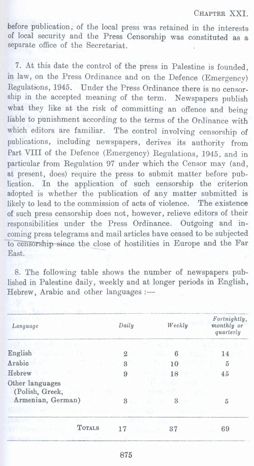 7. At this date the control of the press in Palestine is founded, in law, on the Press Ordinance and on the Defence (Emergency) Regulations, 1945. Under the Press Ordinance there is no censorship in the accepted meaning of the term. Newspapers publish what they like at the risk of committing an offence and being liable to punishment according to the terms of the OrJinance with which editors are familiar. The control involving censorship of publications, including newspapers, derives its authority from Part VIII of the Defence (Emergency) Regulations, 1945. and in particular from Regulation 97 under which the Censor may (and, at present, does) require the press to submit matter before publication. In the application of such censorship the criterion adopted is whether the publication of any matter submitted is likely to lead to the commission of acts of violence. The existence of such press censorship does not, however, relieve editors of their responsibilities under the Press Ordinance. Outgoing and incoming press telegrams and mail articles have ceased to be subjected to censorship--since the close of hostilities in Europe and the Far