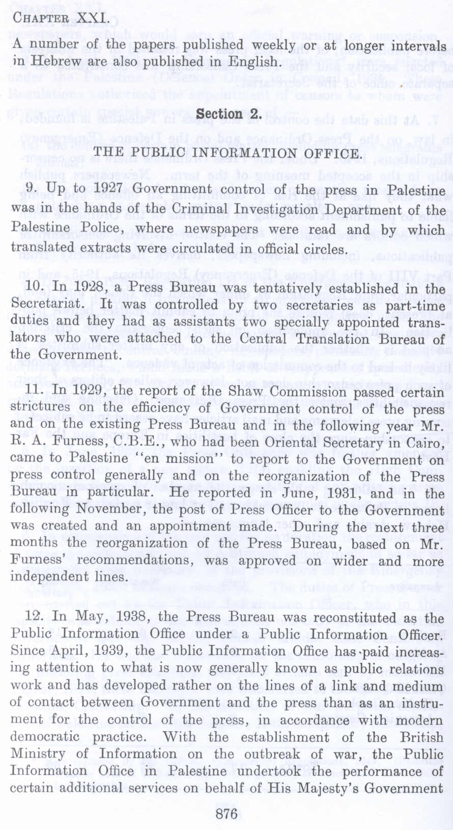 11. In 1929, the report of the Shaw Commission passed certain strictures on the efficiency of Government control of the press and on the existing Press Bureau and in the following year Mr. R. A. Furness, C.B.E., who had been Oriental Secretary in Cairo, came to Palestine "en mission" to report to the Government on press control generally and on the reorganization of the Press Bureau in particular. He reported in June, 1931, and in the following November, the post of Press Officer to the Government was created and an appointment made. During the next three months the reorganization of the Press Bureau, based on Mr. Furness' recommendations, was approved on wider and more independent lines.