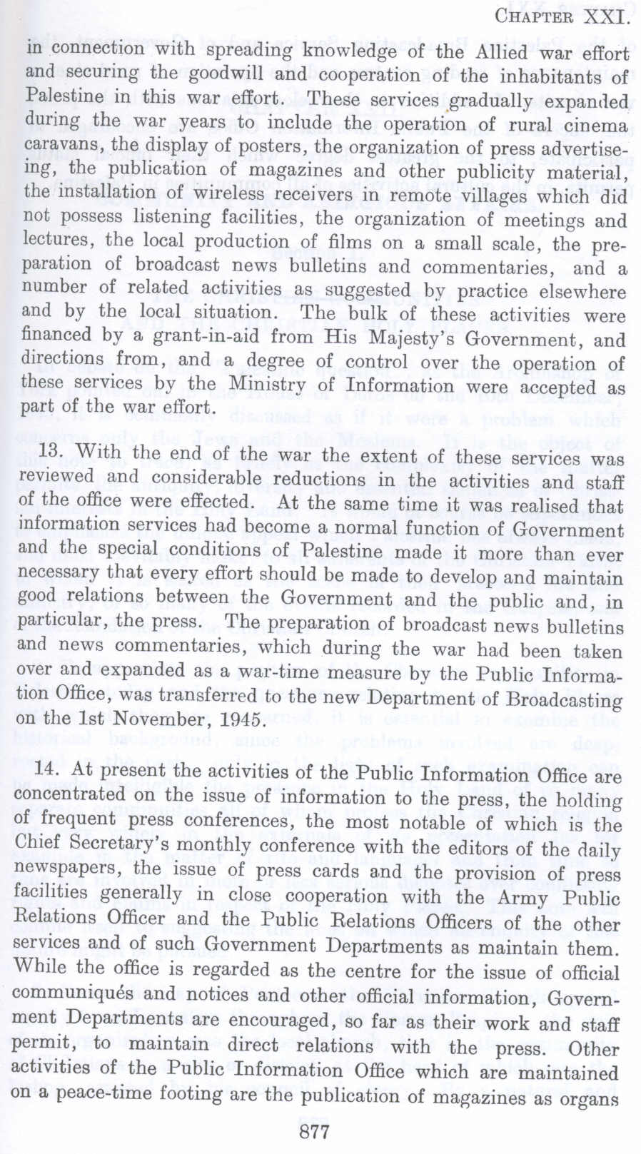 13. With the end of the war the extent of these services was reviewed and considerable reductions in the activities and staff of the office were effected. At the same time it was realised that information services had become a normal function of Government and the special conditions of Palestine made it more than ever necessary that every effort should be made to develop and maintain good relations between the Government and the public and, in particular, the press. The preparation of broadcast news bulletins and news commentaries, which during the war had been taken over and expanded as a war-time measure by the Public Information Office, was transferred to the new Department of Broadcasting on the 1st November, 1945.