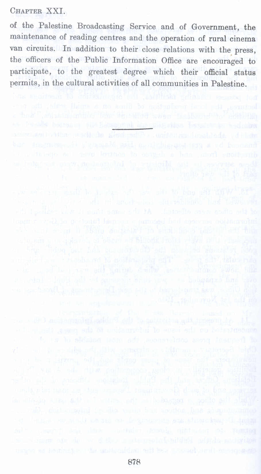 of the Palestine Broadcasting Service and of Government, the maintenance of reading centres and the operation of rural cinema van circuits. In addition to their close relations with the. press, the officers of the Public Information Office are encouraged to participate, to the greatest degree which their official status permits, in the cultural activities of all communities in Palestine.