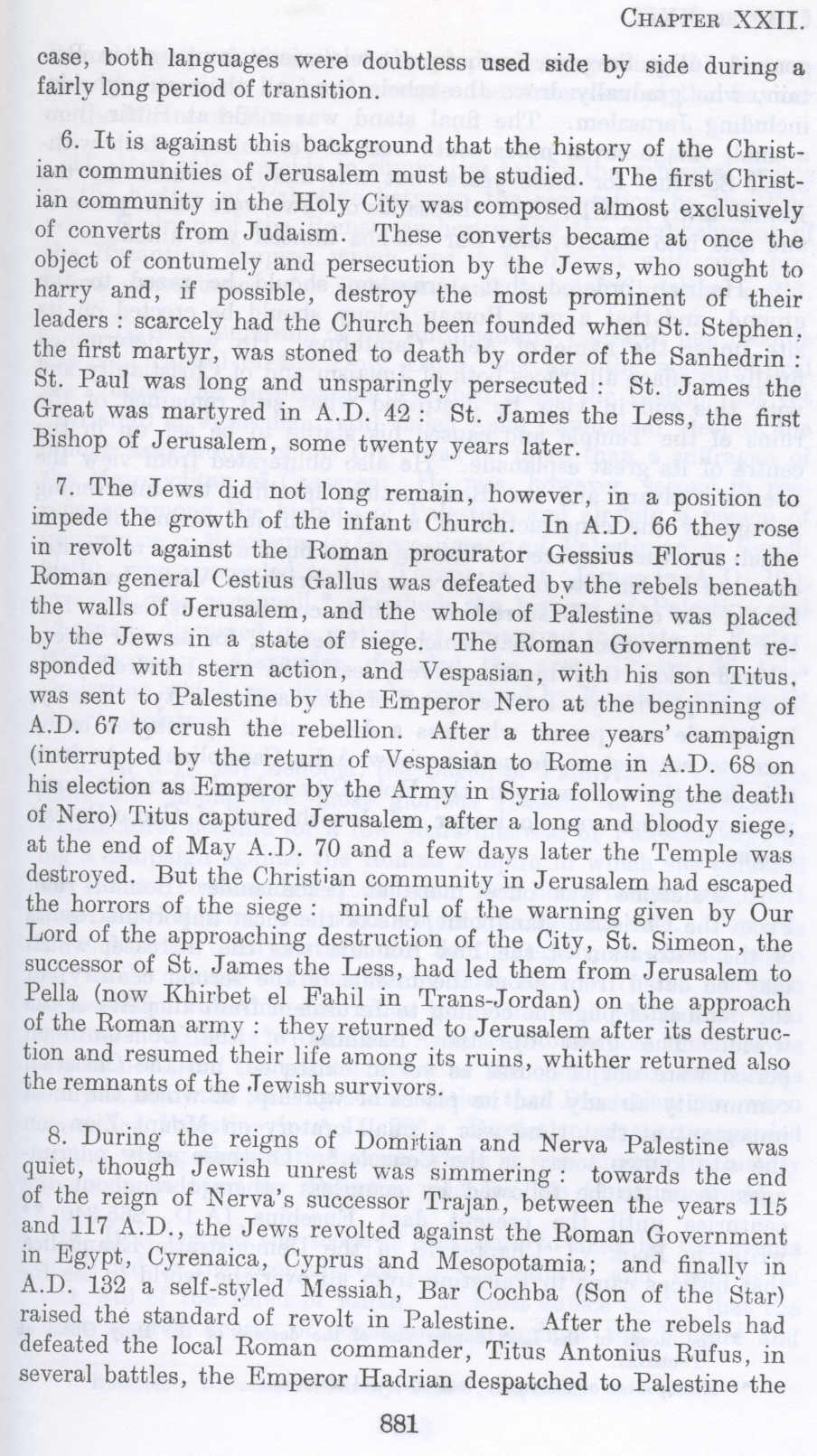 7. The Jews did not long remain, however, in a position to impede the growth of the infant Church. In A.D. 66 they rose in revolt against the Roman procurator Gessius Florus : the Roman general Cestius Gallus was defeated by the rebels beneath the walls of Jerusalem, and the whole of Palestine was placed by the Jews in a state of siege. The Roman Government responded with stem action, and Vespasian, with his son Titus, was sent to Palestine by the Emperor Nero at the beginning of A.D. 67 to crush the rebellion. After a three years' campaign (interrupted by the return of Vespasian to Rome in A.D. 68 on his election as Emperor by the Army in Syria following the death of Nero) Titus captured Jerusalem, after a long and bloody siege, at the end of May A.D. 70 and a few days later the Temple was destroyed. But the Christian community in Jerusalem had escaped the horrors of the siege : mindful of the warning given by Our Lord of the approaching destruction of the City, St. Simeon, the successor of St. James the Less, had led them from Jerusalem to Pella (now Khirbet el Fahil in Trans-Jordan) on the approach of the Roman army : they returned to Jerusalem after its destruction and resumed their life among its ruins, whither returned also the remnants of the .Tewish survivors.