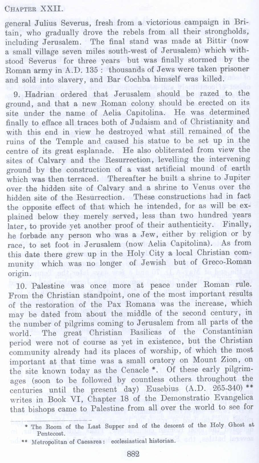From The Christian standpoint, one of the most important results of the restoration of the Pax Romana was the increase, which may be dated from about the middle of the second century, in the number of pilgrims coming to Jerusalem from all parts of the world. The great Christian Basilicas of the Constantinian period were not of course as yet in existence, but the Christian community already bad its places of worship, of which the most important at that time was a small oratory on Mount Zion, on the site known today as the Cenacle *. Of these early pilgrimages (soon to he followed by countless others throughout the centuries until the present day) Eusebius (A.D. 265-340) ** writes in Book VI, Chapter 18 of the Demonstratio Evangelica that bishops came to Palestine from all over the world to see for
