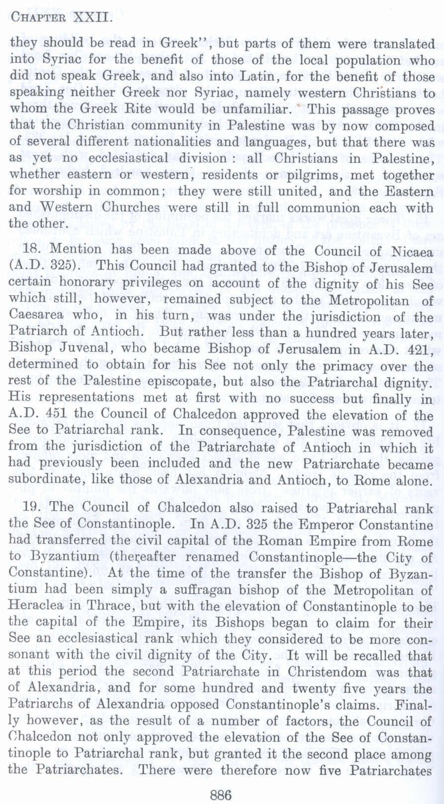 18. Mention has been made above of the Council of Nicaea (A.D. 325). This Council had granted to the Bishop of Jerusalem certain honorary privileges on account of the dignity of his See which still, however, remained subject to the Metropolitan of Caesarea who, in his turn, was under the jurisdiction of the Patriarch of Antioch. But rather less than a. hundred years later, Bishop Juvenal, who became Bishop of Jerusalem in A.D. 421, determined to obtain for his See not only the primacy over the rest of the Palestine episcopate, but also the Patriarchal dignity. His representations met at first with no success but finally in A.D. 451 the Council of Chalcedon approved the elevation of the See to Patriarchal rank. In consequence, Palestine was removed from the jurisdiction of the Patriarchate of Antioch in which it had previously been included and the new Patriarchate became subordinate, like those of Alexandria and Antioch, to Rome alone.
