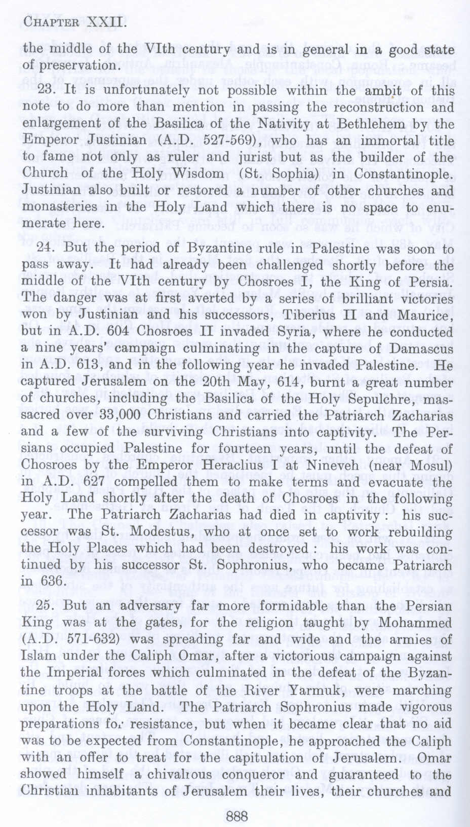 2!. But the period of Byzantine rule in Palestine was soon to pass away. It had already been challenged shortly before the middle of the VIth century by Chosroes I, the King of Persia. The danger was at first averted by a series of brilliant victories won by Justinian and his successors, Tiberius II and Maurice, but in A.D. 604 Chosroes II invaded Syria, where he conducted a nine years' campaign culminating in the capture of Damascus in A.D. 613, and in the following year he invaded Palestine. He captured Jerusalem on the 20th May, 614, burnt a great number of churches, including the Basilica of the Holy Sepulchre, massacred over 33 ,000 Christians and carried the Patriarch Zacharias and a few of the surviving Christians into captivity. The Persians occupied Palestine for fourteen years, until the defeat of Chosroes by the Emperor Heraclius I at Nineveh (near Mosul) in A.D. 627 compelled them to make terms and evacuate the Holy Land shortly after the death of Chosroes in the following year. The Patriarch Zacharias had died in captivity : his successor was St. Modestus, who at once set to work rebuilding the Holy Places which had been destroyed : his work was continued by his successor St. Sophronius, who became Patriarch in 636.