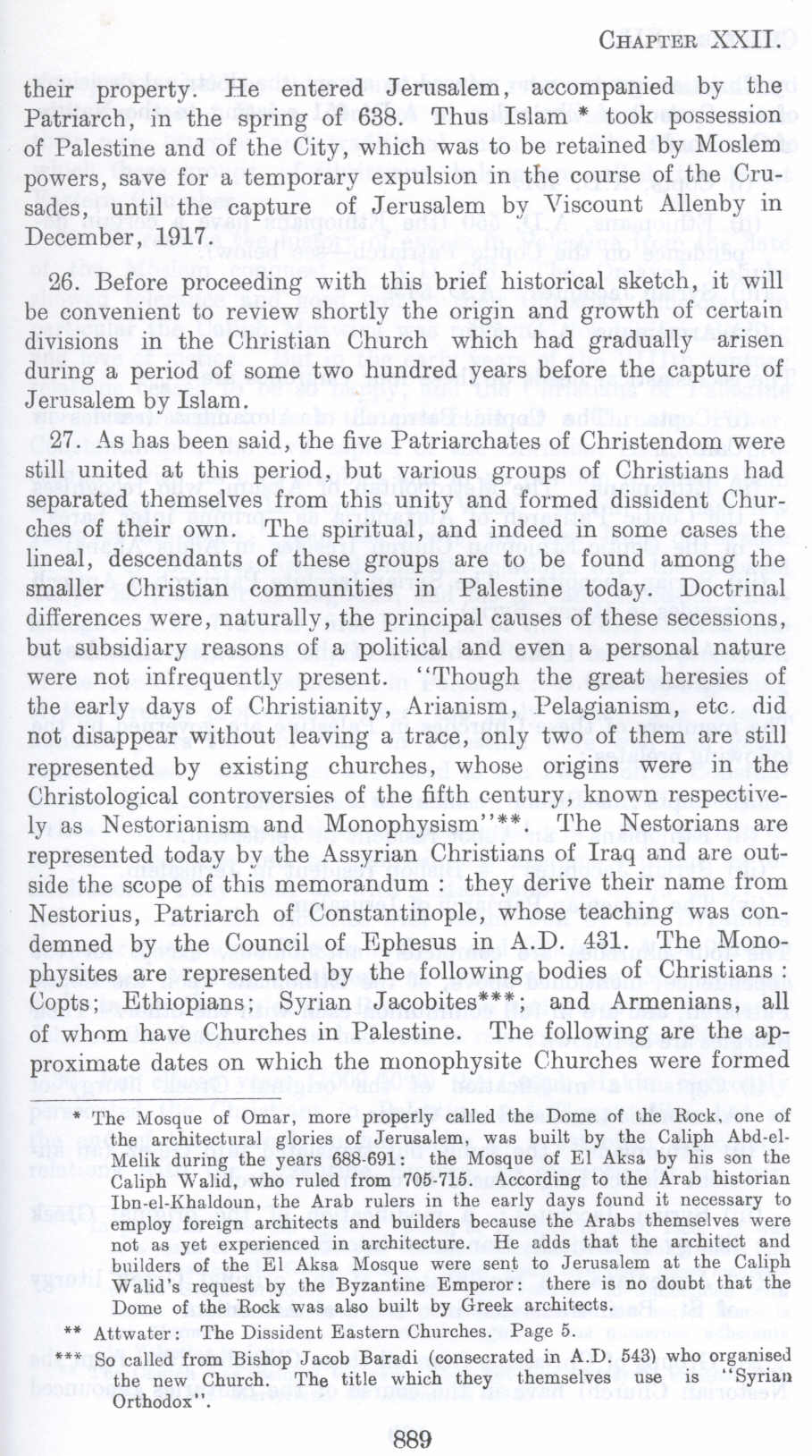 26. Before proceeding with this brief historical sketch, it will be convenient to review shortly the origin and growth of certain divisions in the Christian Church which had gradually arisen during a period of some two hundred years before the capture of Jerusalem by Islam.