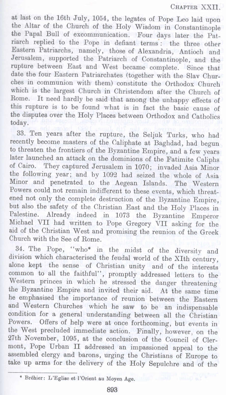33. Ten years after the rupture, the Seljuk Turks, who had recently become masters of the Caliphate at Baghdad, had begun to threaten the frontiers of the Byzantine Empire, and a few years later launched an attack on the dominions of the Fatimite Caliphs of Cairo. They captured Jerusalem in 1070; invaded Asia Minor the following year; and by 1092 had seized the whole of Asia Minor and penetrated to the Aegean Islands. The Western Powers could not remain indifferent to these events, which threatened not only the complete destruction of the Byzantine Empire, but also the safety of the Christian East and the Holy Places in Palestine. Already indeed in 1073 the Byzantine Emperor Michael VII had written to Pope Gregory VII asking for the aid of the Christian West and promising the reunion of the Greek Church with the See of Rome.