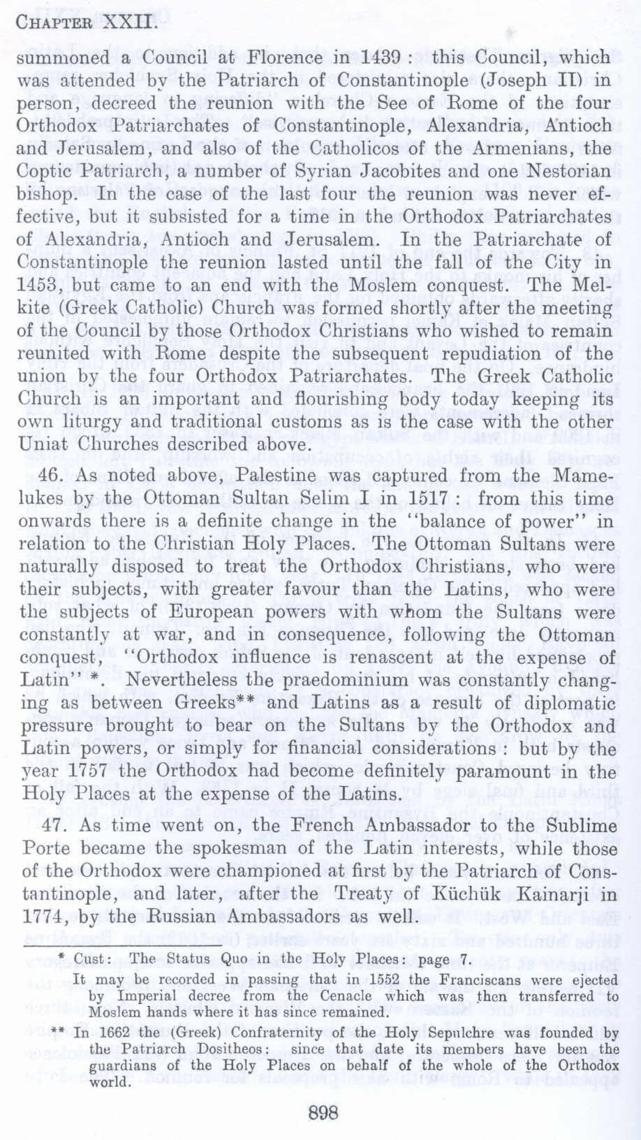 46. As noted above, Palestine was captured from the Mamelukes by the Ottoman Sultan Selim I in 1517 : from this time onwards there is a definite change in the "balance of power" in relation to the Christian Holy Places. The Ottoman Sultans were naturally disposed to treat the Orthodox Christians, who were their subjects, with greater favour than the Latins, who were the subjects of European powers with whom the Sultans were constantly at war, and in consequence, following the Ottoman conquest, "Orthodox influence is renascent at the expense of Latin"*. Nevertheless the praedorninium was constantly changing as between Greeks** and Latins as a result of diplomatic pressure brought to bear on the Sultans by the Orthodox and Latin powers, or simply for financial considerations : but by the year 1757 the Orthodox had become definitely paramount in the Holy Places at the expense of the Latins.