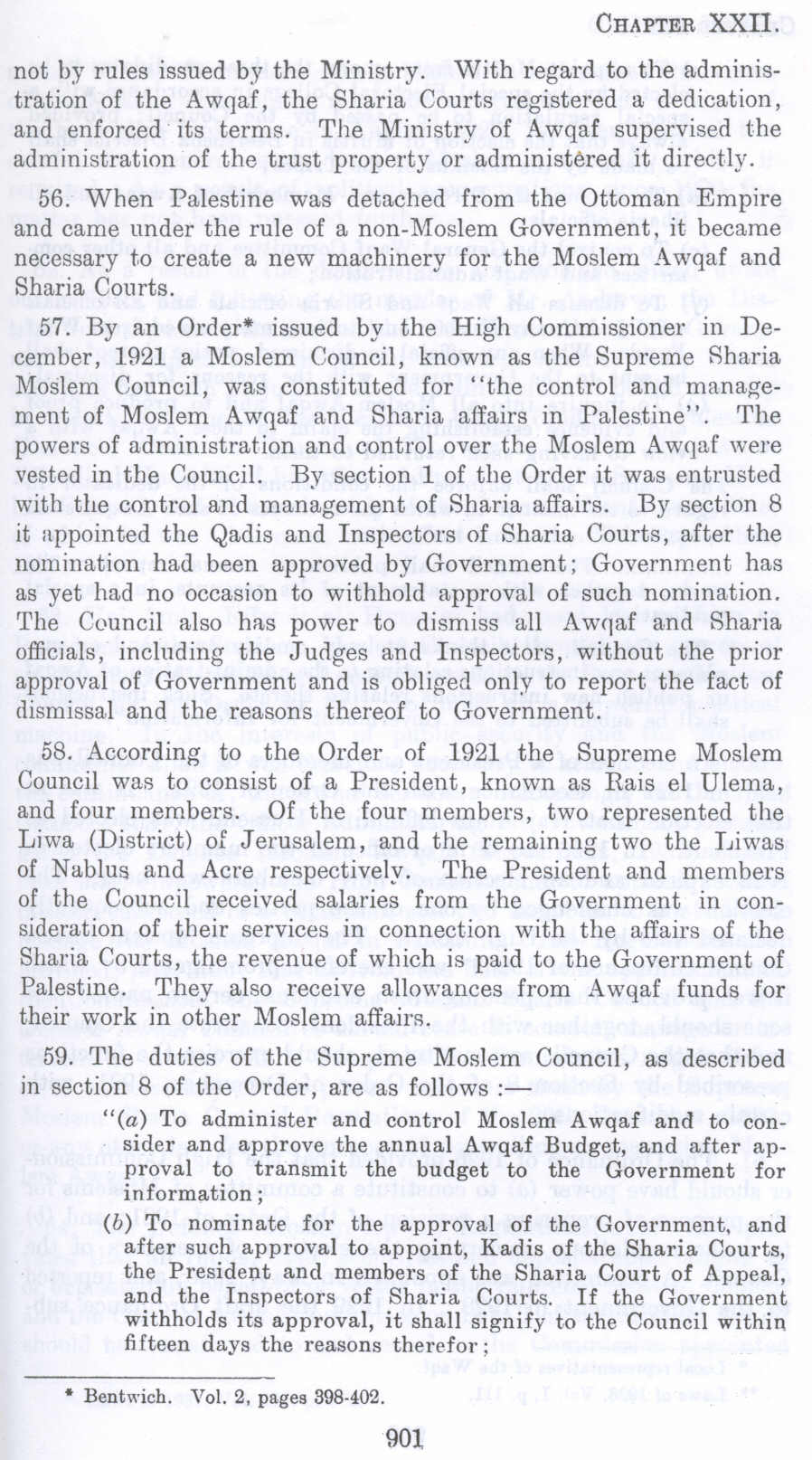 56. When Palestine was detached from the Ottoman Empire and came under the rule of a non-Moslem Government, it became necessary to create a new machinery for the Moslem Awqaf and Sharia Courts.