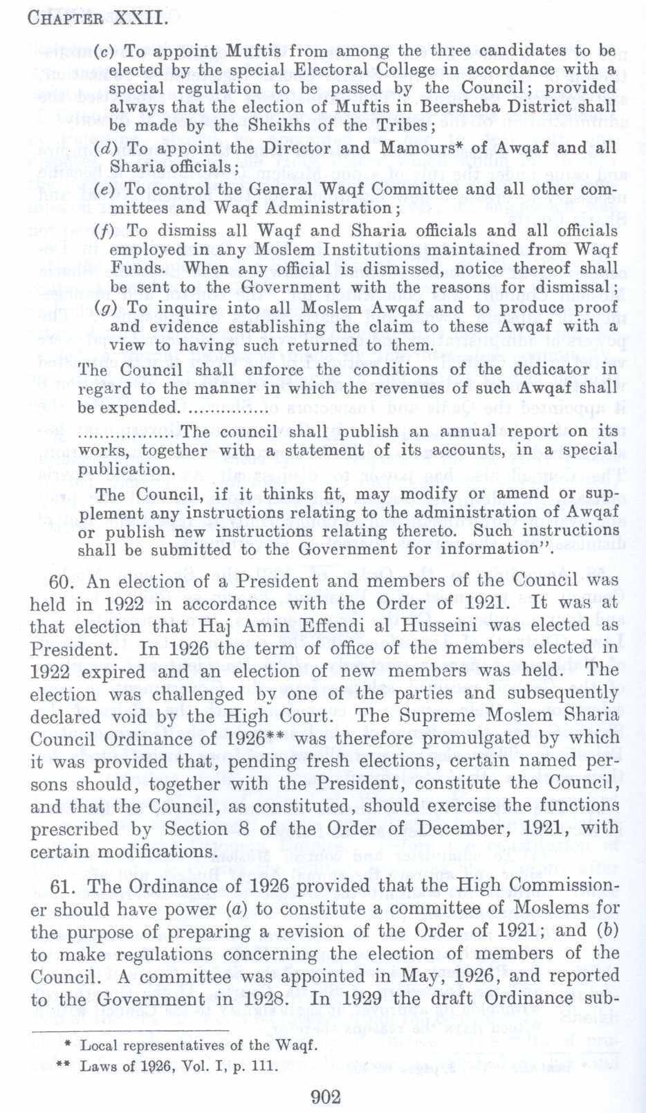 60. An election of a President and members of the Council was held in 1922 in accordance with the Order of 1921. It was at that election that Haj Amin Effendi al Husseini was elected as President. In 1926 the term of office of the members elected in 1922 expired and an election of new members was held. The election was challenged by one of the parties and subsequently declared void by the High Court. The Supreme Moslem Sharia Council Ordinance of 1926** was therefore promulgated by which it was provided that, pending fresh elections, certain named persons should, together with the President, constitute the Council, and that the Council, as constituted, should exercise the functions prescribed by Section 8 of the Order of December, 1921, with certain modifications.
