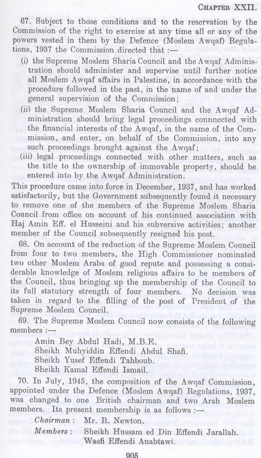 70. In July, 1945, the composition of the Awqaf Commission, appointed under the Defence (Moslem Awqaf) Regulations, 1937, was changed to one British chairman and two Arab Moslem members. Its present membership is as follows :-