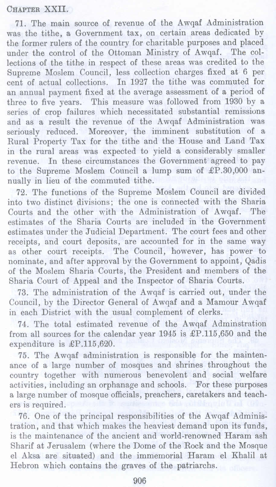 71. The main source of revenue of the Awqaf Administration was the tithe, a Government tax, on certain areas dedicated by the former rulers of the country for charitable purposes and placed under the control of the Ottoman Ministry of Awqaf. The collections of the tithe in respect of these areas was credited to the Supreme Moslem Council, less collection charges fixed at 6 per cent of actual collections. In 1927 the tithe was commuted for an annual payment fixed at the average assessment of a period of three to five years. This measure was followed from 1930 by a series of crop failures which necessitated substantial remissions and as a result the revenue of the Awqaf Administration was seriously reduced. Moreover, the imminent substitution of a Rural Property Tax for the tithe and the Rouse and Land Tax in the rural areas was expected to yield a considerably smaller revenue. In these circumstances the Government agreed to pay to the Supreme Moslem Council a lump sum of £P.30,000 annually in lieu of the commuted tithe.