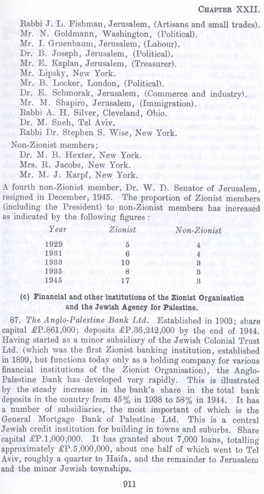 A fourth non-Zionist member, Dr. W. D. Senator of Jerusalem, resigned in December, 1945. The proportion of Zionist members (including the President) to non-Zionist members has increased as indicated by the following figures :