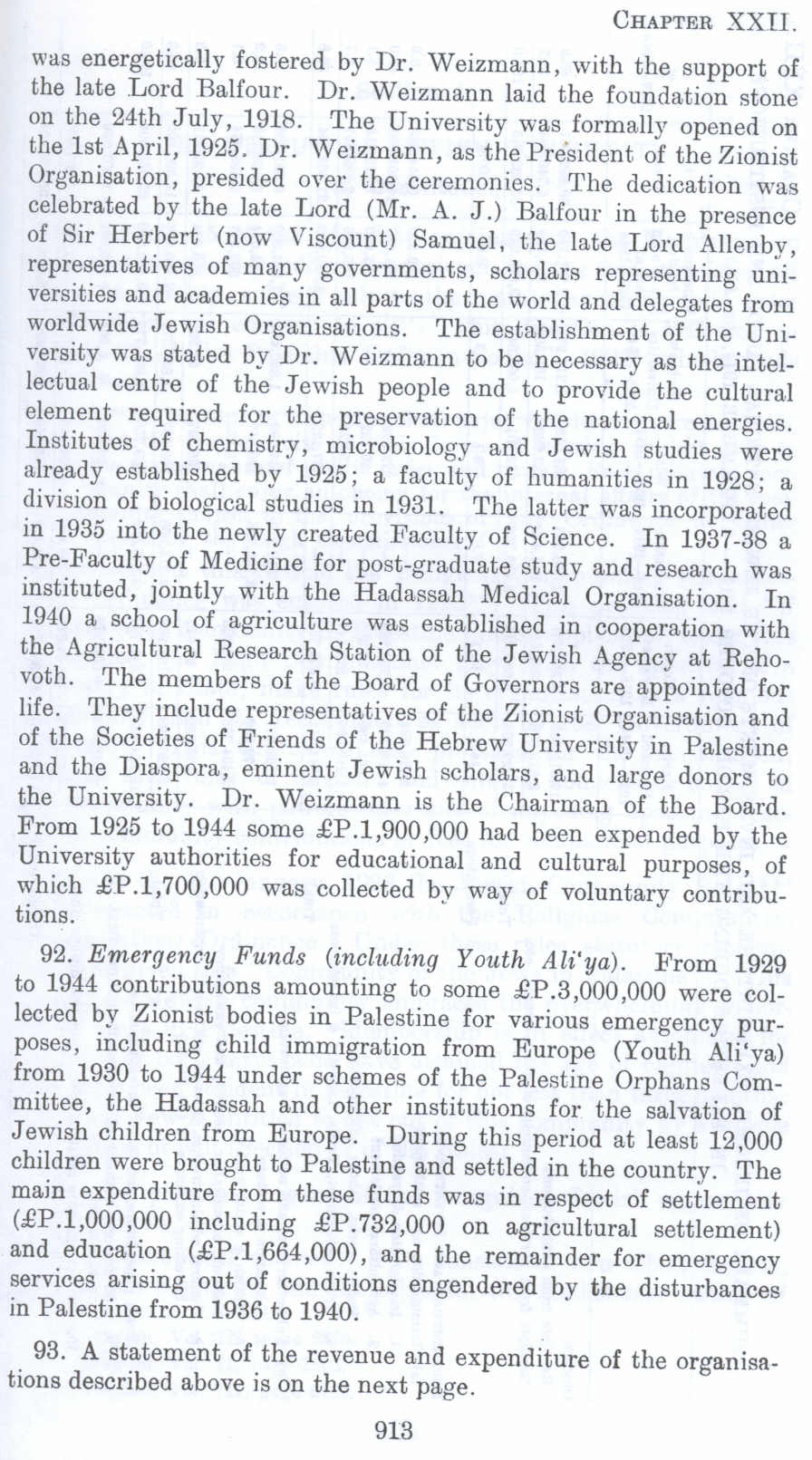 was energetically fostered by Dr. Weizmann, with the support of the late Lord Balfour. Dr. Weizmann laid the foundation stone on the 24th July, 1918. The University was formally opened on the 1st April, 1925. Dr. Weizmann, as the President of the Zionist Organisation, presided over the ceremonies. The dedication was celebrated by the late Lord (Mr. A. J.) Balfour in the presence of Sir Herbert (now Viscount) Samuel, the late Lord Allen by, representatives of many governments, scholars representing universities and academies in all parts of the world and delegates from worldwide Jewish Organisations. The establishment of the University was stated by Dr. Weizmann to be necessary as the intellectual centre of the Jewish people and to provide the cultural element required for the preservation of the national energies. Institutes of chemistry, microbiology and Jewish studies were already established by 1925; a faculty of humanities in 1928; a division of biological studies in 1931. The latter was incorporated in 1935 into the newly created Faculty of Science. In 1937-38 a Pre-Faculty of Medicine for post-graduate study and research was instituted, jointly with the Hadassah Medical Organisation. In 1940 a school of agriculture was established in cooperation with the Agricultural Research Station of the Jewish Agency at Rehovotb. The members of the Board of Governors are appointed for life. They include representatives of the Zionist Organisation and of the Societies of Friends of the Hebrew University in Palestine and the Diaspora, eminent Jewish scholars, and large donors to the University. Dr. Weizmann is the Chairman of the Board. From 1925 to 1944 some £P.l,900,000 had been expended by the University authorities for educational and cultural purposes, of which £P.l,700,000 was collected by way of voluntary contributions.