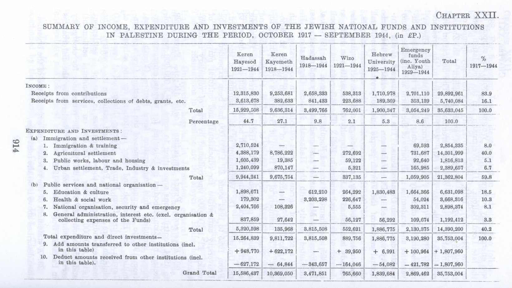 Summary of Income, Expenditure, And investment of Jewish National Fund in Palestine before 1948 (Nakba), British Mandate: A Survey of Palestine: Volume II - Page 914. Chapter XXII: Community And Religious Affairs: Section 3: The Zionist Organization and The Jewish Agency |