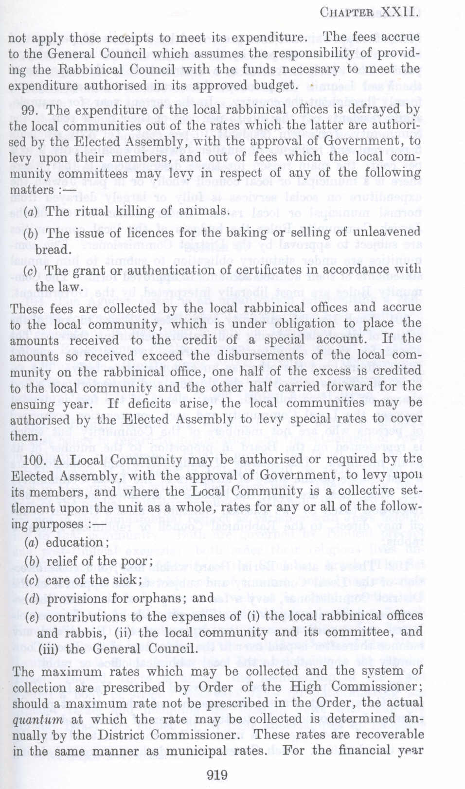 99. The expenditure of the local rabbinical offices is defrayed by the local communities out of the rates which the latter are authorised by the Elected Assembly, with the approval of Government, to levy upon their members, and out of fees which the local community committees may levy in respect of any of the following matters:-