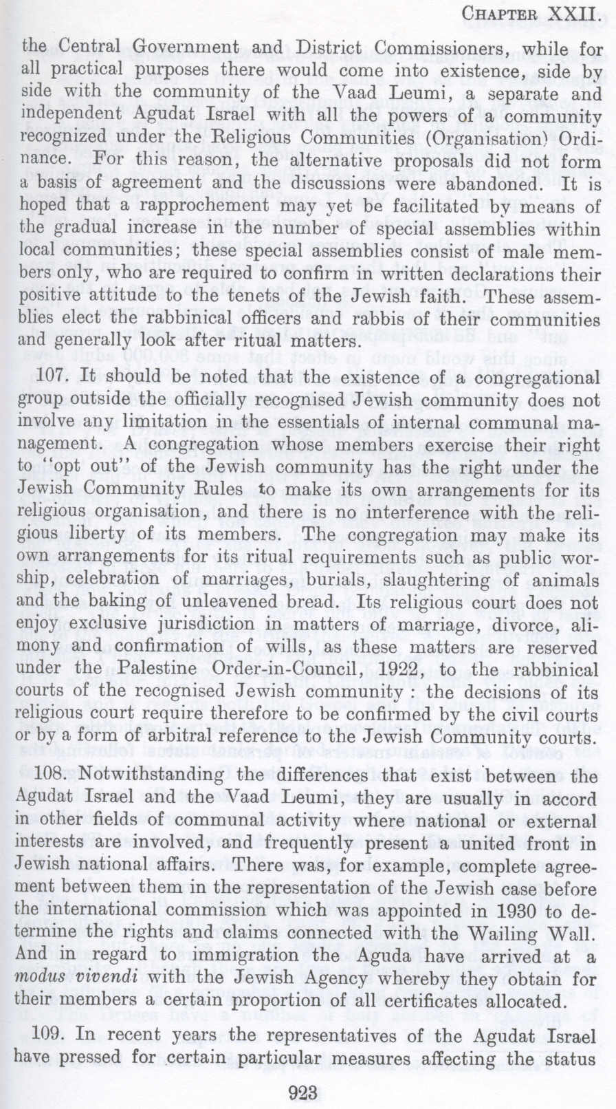 107. It should be noted that the existence of a congregational group outside the officially recognised Jewish community does not involve any limitation in the essentials of internal communal management. A congregation whose members exercise their right to "opt out" of the Jewish community has the right under the Jewish Community Rules to make its own arrangements for its religious organisation, and there is no interference with the religious liberty of its members. The congregation may make its own arrangements for its ritual requirements such as public worship, celebration of marriages, burials, slaughtering of animals and the baking of unleavened bread. Its religious court does not enjoy exclusive jurisdiction in matters of marriage, divorce, alimony and confirmation of wills, as these matters are reserved under the Palestine Order-in-Council, 1922, to the rabbinical courts of the recognised Jewish community : the decisions of its religious court require therefore to be confirmed by the civil courts or by a form of arbitral reference to the Jewish Community courts.