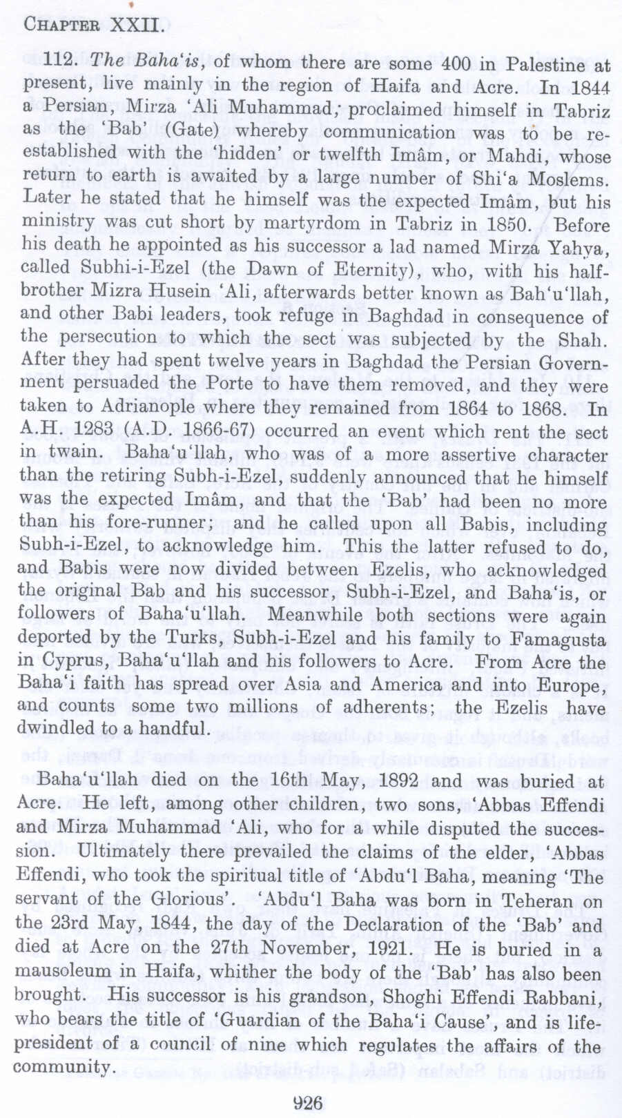 112. The Baha'is, of whom there are some 400 in Palestine at present, live mainly in the region of Haifa and Acre. In 1844 a Persian, Mirza 'Ali Muhammad; proclaimed himself in Tabriz as the 'Bab' (Gate) whereby communication was to be reestablished with the 'hidden' or twelfth Imam, or Mahdi, whose return to earth is awaited by a large number of Sbi'a Moslems. Later be stated that he himself was the expected Imam, but his ministry was cut short by martyrdom in Tabriz in 1850. Before his death he appointed as his successor a lad named Mirza Yahya, called Subhi-i-Ezel (the Dawn of Eternity), who, with his half brother Mizra Husein 'Ali, afterwards better known as Bah'u'llah, and other Babi leaders, took refuge in Baghdad in consequence of the persecution to which the sect was subjected by the Shah. After they had spent twelve years in Baghdad the Persian Government persuaded the Porte to have them removed, and they were taken to Adrianople where they remained from 1864 to 1868. In A.H. 1283 (A.D. 1866-67) occurred an event which rent the sect in twain. Baha'u'Ilah , who was of a more assertive character than the retiring Subh-i-Ezel, suddenly announced that be himself was the expected Imam, and that the 'Bab' had been no more than his fore-runner; and he called upon all Babis, including Subh-i-Ezel , to acknowledge him. This the latter refused to do, and Babis were now divided between Ezelis, who acknowledged the original Bab and his successor, Subh-i-Ezel, and Baha'is, or followers of Bahau'Ilah. Meanwhile both sections were again deported by the Turks, Subh-i-Ezel and his family to Famagusta in Cyprus, Baha'u'Ilah and his followers to Acre. From Acre the Baha'i faith has spread over Asia and America and into Europe, and counts some two millions of adherents; the Ezelis have dwindled to a handful.