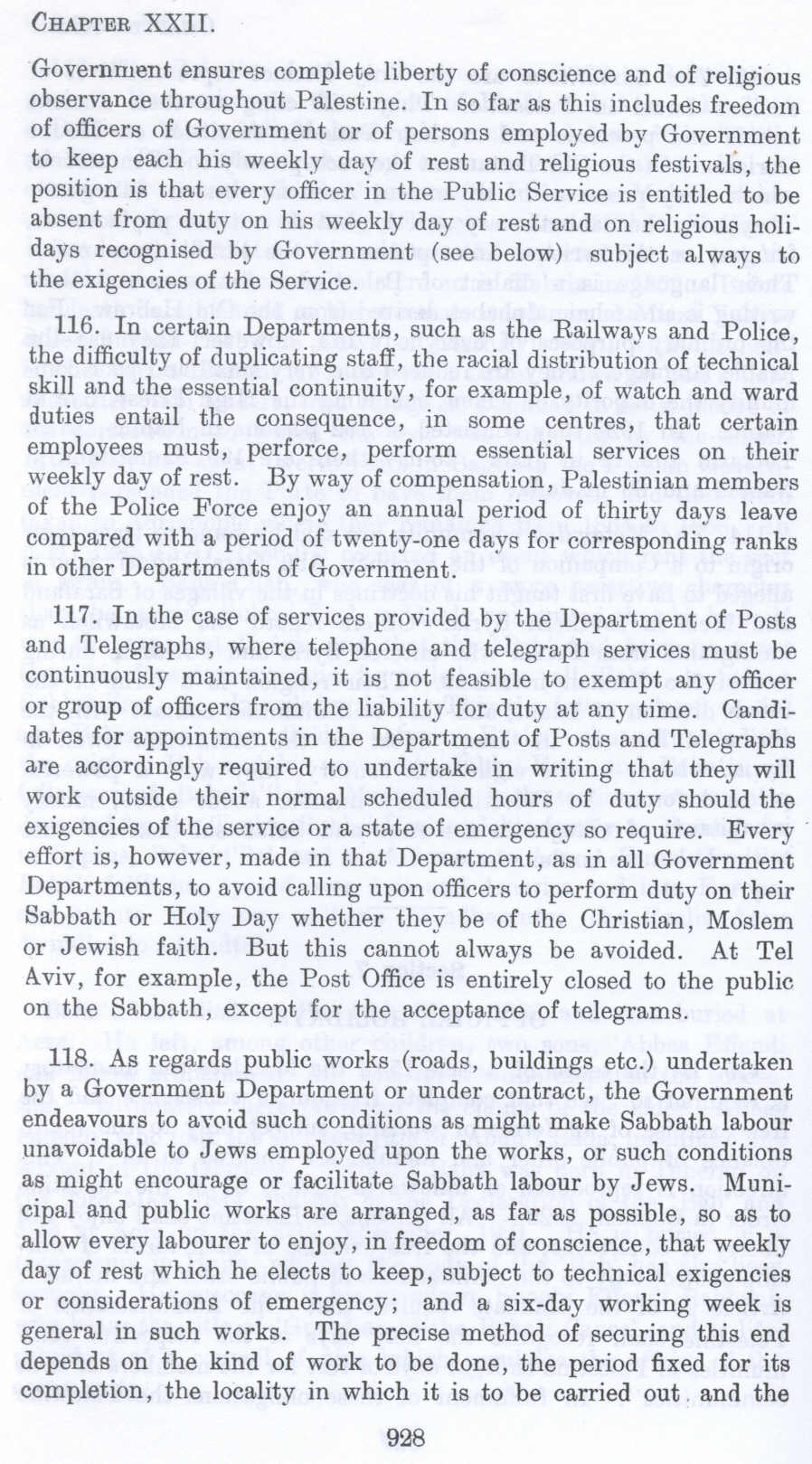 116. In certain Departments, such as the Railways and Police, the difficulty of duplicating staff, the racial distribution of technical skill and the essential continuity, for example, of watch and ward duties entail the consequence, in some centres, that certain employees must, perforce, perform essential services on their weekly day of rest. By way of compensation, Palestinian members of the Police Force enjoy an annual period of thirty days leave compared with a period of twenty-one days for corresponding ranks in other Departments of Government.