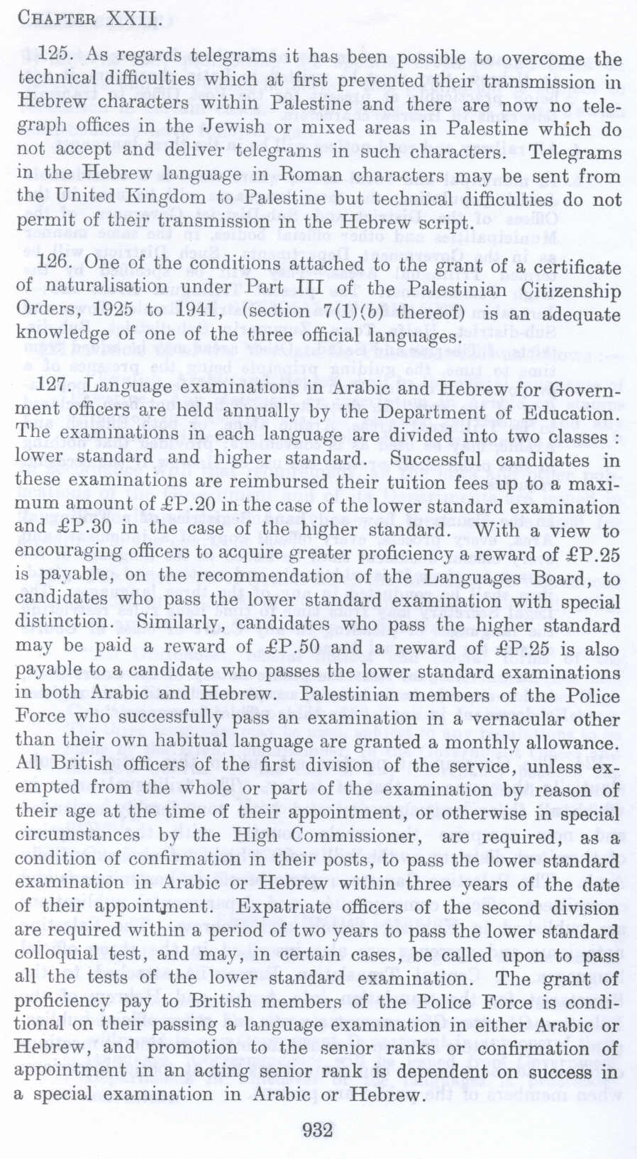 127. Language examinations in Arabic and Hebrew for Government officers are held annually by the Department of Education. The examinations in each language are divided into two classes : lower standard and higher standard. Successful candidates in these examinations are reimbursed their tuition fees up to a maximum amount of £P.20 in the case of the lower standard examination and £P.30 in the case of the higher standard. With a view to encouraging officers to acquire greater proficiency a reward of £P .25 is payable, on the recommendation of the Languages Board, to candidates who pass the lower standard examination with special distinction. Similarly, candidates who pass the higher standard may be paid a reward of £P.50 and a reward of £P.25 is also payable to a candidate who passes the lower standard examinations in both Arabic and Hebrew. Palestinian members of the Police Force who successfully pass an examination in a vernacular other than their own habitual language are granted a monthly allowance. All British officers of the first division of the service, unless exempted from the whole or part of the examination by reason of their age at the time of their appointment, or otherwise in special circumstances by the High Commissioner, are required, as a condition of confirmation in their posts, to pass the lower standard examination in Arabic or Hebrew within three years of the date of their appointment. Expatriate officers of the second division are required within a period of two years to pass the lower standard colloquial test, and may, in certain cases, be called upon to pass all the tests of the lower standard examination. The grant of proficiency pay to British members of the Police Force is conditional on their passing a language examination in either Arabic or Hebrew, and promotion to the senior ranks or confirmation of appointment in an acting senior rank is dependent on success in a special examination in Arabic or Hebrew.