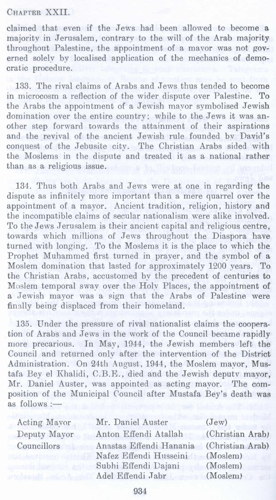 133. The rival claims of Arabs and Jews thus tended to become in microcosm a reflection of the wider dispute over Palestine. To the Arabs the appointment of a Jewish mayor symbolised Jewish domination over the entire country : while to the Jews it was another step forward towards the -attainment of their aspirations and the revival of the ancient Jewish rule founded by David's conquest of the Jebusite city. The Christian Arabs sided with the Moslems in the dispute and treated it as a national rather than as a religious issue.