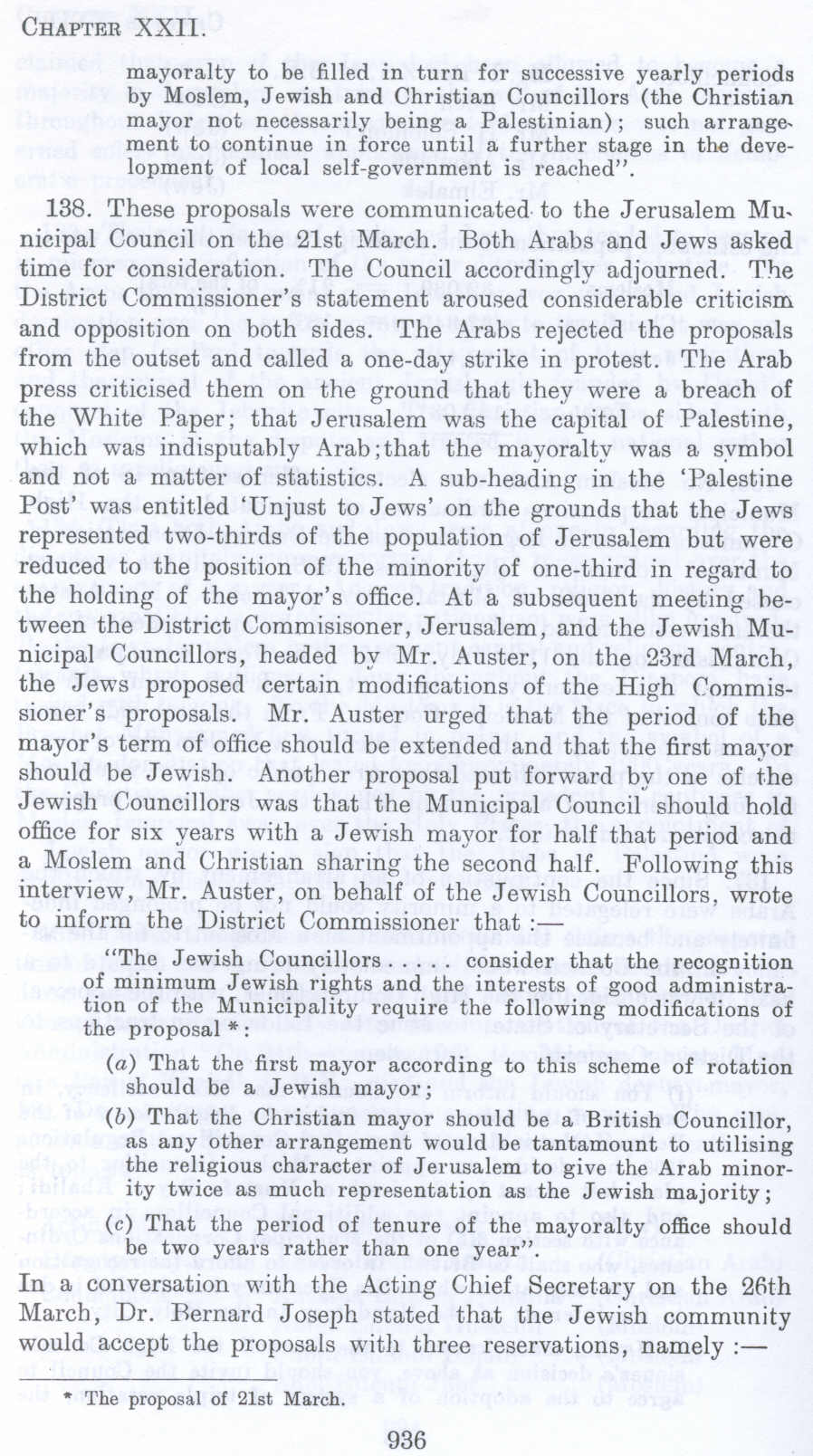 138. These proposals were communicated. to the Jerusalem Municipal Council on the 21st March. Both Arabs and Jews asked time for consideration. The Council accordingly adjourned. '!'he District Commissioner's statement aroused considerable criticism and opposition on both sides. The Arabs rejected the proposals from the outset and called a one-day strike in protest. The Arab press criticised them on the ground that they were a breach of the White Paper; that Jerusalem was the capital of Palestine, which was indisputably Arab; that the mayoralty was a symbol and not a matter of statistics. A sub-heading in the 'Palestine Post' was entitled 'Unjust to Jews' on the grounds that the Jews represented two-thirds of the population of Jerusalem but were reduced to the position of the minority of one-third in regard to the holding of the mayor's office. At a subsequent meeting between the District Commissioner, Jerusalem, and the Jewish Municipal Councillors, headed by Mr. Auster, on the 23rd March, the Jews proposed certain modifications of the High Commissioner's proposals. Mr. Auster urged that the period of the mayor's term of office should be extended and that the first mayor should be Jewish. Another proposal put forward by one of the Jewish Councillors was that the Municipal Council should hold office for six years with a Jewish mayor for half that period and a Moslem and Christian sharing the second half. Following this interview, Mr. Auster, on behalf of the Jewish Councillors, wrote to inform the District Commissioner that :-