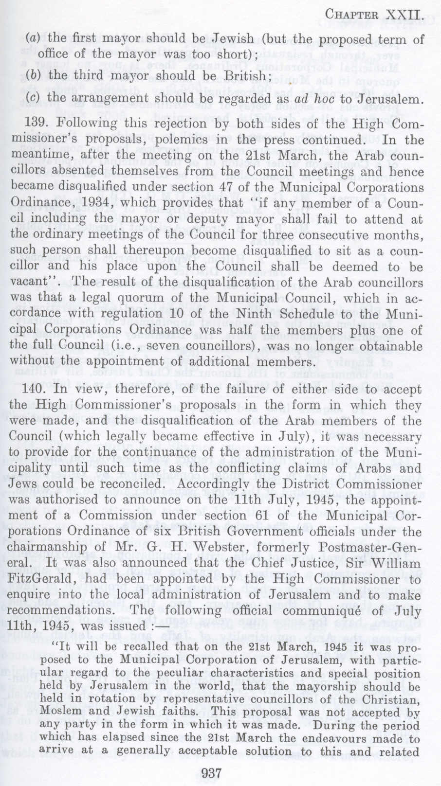 140. In view, therefore, of the failure of either side to accept the High Commissioner's proposals in the form in which they were made, and the disqualification of the Arab members of the Council (which legally became effective in July), it was necessary to provide for the continuance of the administration of the Municipality until such time as the conflicting olaims of Arabs and Jews could be reconciled. Accordingly the District Commissioner was authorised to announce on the 11th July, 1945, the appointment of a Commission under section 61 of the Municipal Corporations Ordinance of six British Government officials under the chairmanship of Mr. G. H. "Webster, formerly Postmaster-General. It was also announced that the Chief Justice, Sir William FitzGeralcl, had been appointed by the High Commissioner to enquire into the local administration of Jerusalem and to make recommendations. The following official communique of July 11th, 1945, was issued :-