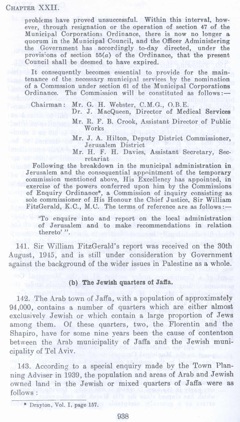 Following the breakdown in the municipal administration in Jerusalem and the consequential appointment of the temporary commission mentioned above, His Excellency has appointed, in exercise of the powers conferred upon him by the Commissions of Enquiry Ordinance", a Commission of inquiry consisting as sole commissioner of His Honour the Chief Justice, Sir William FitzGerald, K.C., M.U. The terms of reference are as follows:-