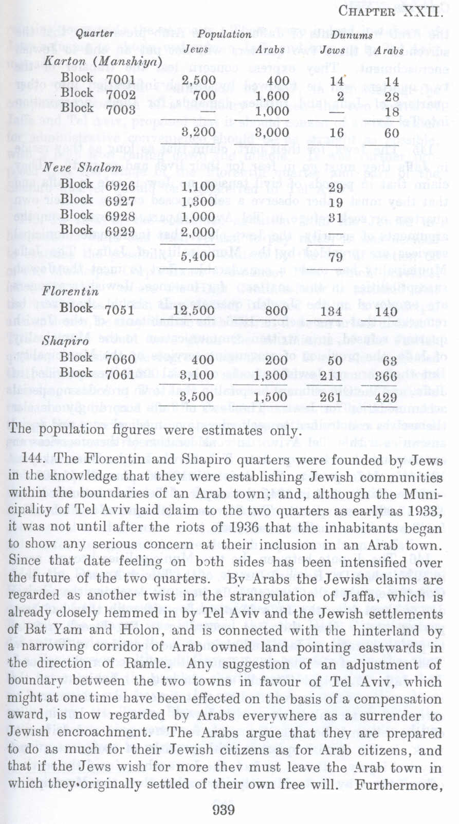 144. The Florentin and Shapiro quarters were founded by Jews in the knowledge that they were establishing Jewish communities within the boundaries of an Arab town; and, although the Municipality of Tel Aviv laid claim to the two quarters as early as 1933, it was not until after the riots of 1936 that the inhabitants began to show any serious concern at their inclusion in an Arab town. Since that date feeling on both sides has been intensified over the future of the two quarters. By Arabs the Jewish claims are regarded as another twist in the strangulation of Jaffa, which is already closely hemmed in by Tel Aviv and the Jewish settlements of Bat Yam and Rolon, and is connected with the hinterland by a narrowing corridor of Arab owned land pointing eastwards in the direction of Ramie. Any suggestion of an adjustment of boundary between the two towns in favour of Tel Aviv, which might at one time have been effected on the basis of a compensation award, is now regarded by Arabs everywhere as a surrender to Jewish encroachment. The Arabs argue that they are prepared to do as much for their Jewish citizens as for Arab citizens, and that if The Jews wish for more They must leave the Arab town in which they-originally settled of their own free will. Furthermore,